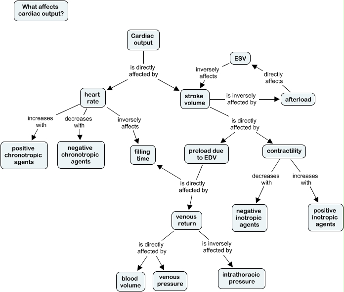 This Concept Map, created with IHMC CmapTools, has information related to: MamleQuarmyneTutorial, stroke volume is directly affected by contractility, venous return is directly affected by venous pressure, preload due to EDV is directly affected by filling time, Cardiac output is directly affected by heart rate, stroke volume is directly affected by preload due to EDV, heart rate decreases with negative chronotropic agents, afterload directly affects ESV, Cardiac output is directly affected by stroke volume, contractility decreases with negative inotropic agents, preload due to EDV is directly affected by venous return, venous return is inversely affected by intrathoracic pressure, heart rate increases with positive chronotropic agents, stroke volume is inversely affected by afterload, contractility increases with positive inotropic agents, venous return is directly affected by blood volume, heart rate inversely affects filling time