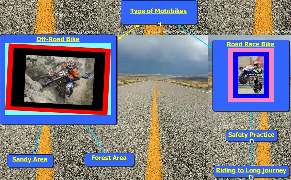This Concept Map, created with IHMC CmapTools, has information related to: My Motobikes (Final), Safety Practice Riding to Long journey, Off-Road Bike Sandy Area, Off-Road Bike Forest Area, Type of Motobikes Off-Road Bike, Road Race Bike Safety Practice, Type of Motobikes Road Race Bike