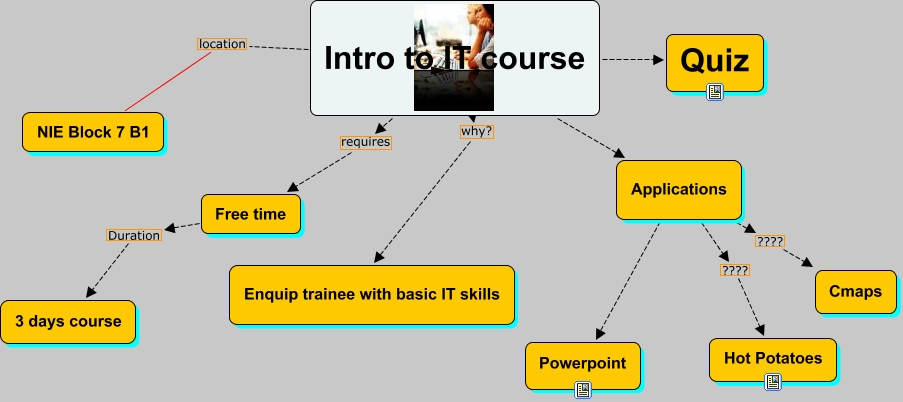 This Concept Map, created with IHMC CmapTools, has information related to: Intro to IT course, Intro to IT course ???? Quiz, Intro to IT course Applications, Applications ???? Cmaps, Applications ???? Hot Potatoes, Intro to IT course why? Enquip trainee with basic IT skills, Intro to IT course requires Free time, Intro to IT course location NIE Block 7 B1, Free time Duration 3 days course, Applications ???? Powerpoint