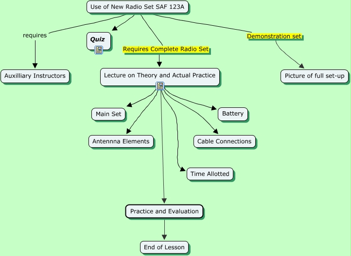 This Concept Map, created with IHMC CmapTools, has information related to: New Radio Set SAF123A, Lecture on Theory and Actual Practice Practice and Evaluation, Use of New Radio Set SAF 123A Quiz, Lecture on Theory and Actual Practice Antennna Elements, Lecture on Theory and Actual Practice Time Allotted, Use of New Radio Set SAF 123A Requires Complete Radio Set Lecture on Theory and Actual Practice, Use of New Radio Set SAF 123A requires Auxilliary Instructors, Lecture on Theory and Actual Practice Battery, Use of New Radio Set SAF 123A Demonstration set Picture of full set-up, Practice and Evaluation End of Lesson, Lecture on Theory and Actual Practice Cable Connections, Lecture on Theory and Actual Practice Main Set