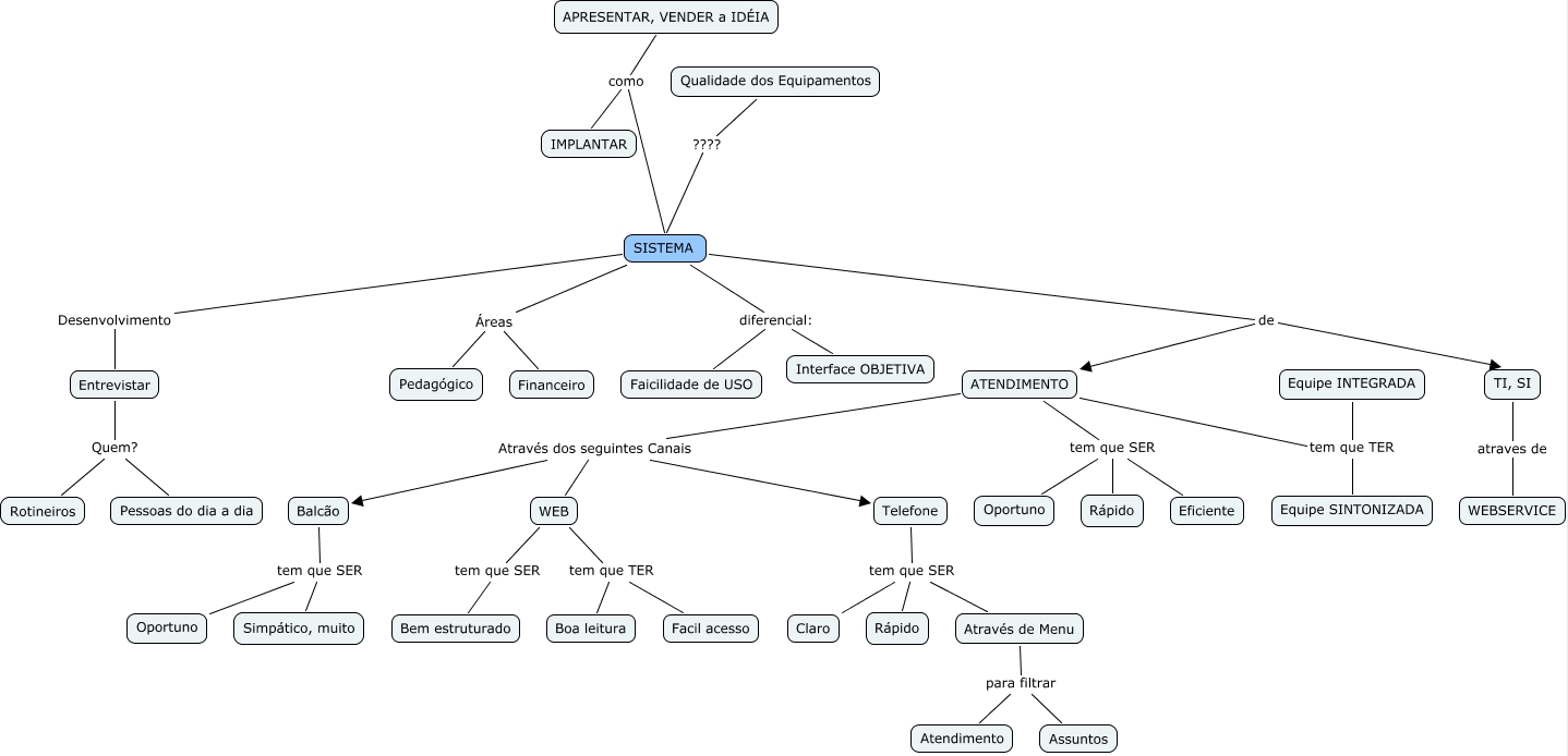 Esse mapa conceitual, produzido no IHMC CmapTools, tem a informação relacionada a: _Sistema, Telefone tem que SER Através de Menu, APRESENTAR, VENDER a IDÉIA como SISTEMA, ATENDIMENTO Através dos seguintes Canais WEB, Através de Menu para filtrar Assuntos, WEB tem que SER Bem estruturado, ATENDIMENTO Através dos seguintes Canais Balcão, ATENDIMENTO tem que TER Equipe SINTONIZADA, SISTEMA de TI, SI, SISTEMA Áreas Pedagógico, ATENDIMENTO Através dos seguintes Canais Telefone, SISTEMA de ATENDIMENTO, SISTEMA Áreas Financeiro, ATENDIMENTO tem que SER Eficiente, APRESENTAR, VENDER a IDÉIA como IMPLANTAR, ATENDIMENTO tem que SER Oportuno, ATENDIMENTO tem que SER Rápido, Balcão tem que SER Oportuno, WEB tem que TER Boa leitura, WEB tem que TER Facil acesso, Através de Menu para filtrar Atendimento