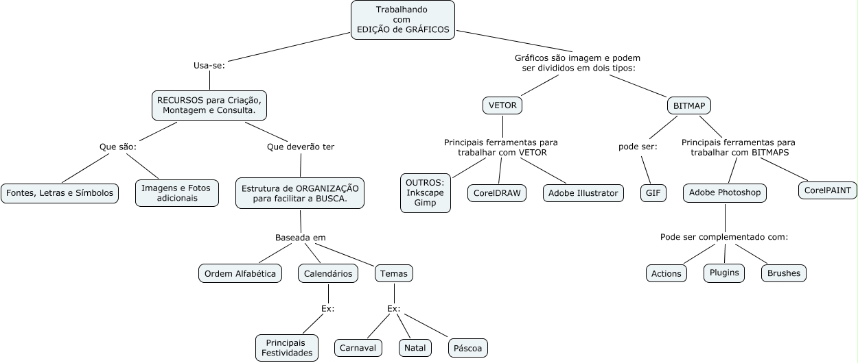 Esse mapa conceitual, produzido no IHMC CmapTools, tem a informação relacionada a: Edição, BITMAP Principais ferramentas para trabalhar com BITMAPS CorelPAINT, Estrutura de ORGANIZAÇÃO para facilitar a BUSCA. Baseada em Temas, Temas Ex: Páscoa, Trabalhando com EDIÇÃO de GRÁFICOS Gráficos são imagem e podem ser divididos em dois tipos: VETOR, Adobe Photoshop Pode ser complementado com: Plugins, Temas Ex: Natal, RECURSOS para Criação, Montagem e Consulta. Que deverão ter Estrutura de ORGANIZAÇÃO para facilitar a BUSCA., RECURSOS para Criação, Montagem e Consulta. Que são: Fontes, Letras e Símbolos, VETOR Principais ferramentas para trabalhar com VETOR CorelDRAW, VETOR Principais ferramentas para trabalhar com VETOR Adobe Illustrator, Adobe Photoshop Pode ser complementado com: Actions, Adobe Photoshop Pode ser complementado com: Brushes, VETOR Principais ferramentas para trabalhar com VETOR OUTROS: Inkscape Gimp, Temas Ex: Carnaval, Calendários Ex: Principais Festividades, Trabalhando com EDIÇÃO de GRÁFICOS Usa-se: RECURSOS para Criação, Montagem e Consulta., Estrutura de ORGANIZAÇÃO para facilitar a BUSCA. Baseada em Ordem Alfabética, RECURSOS para Criação, Montagem e Consulta. Que são: Imagens e Fotos adicionais, Estrutura de ORGANIZAÇÃO para facilitar a BUSCA. Baseada em Calendários, BITMAP pode ser: GIF