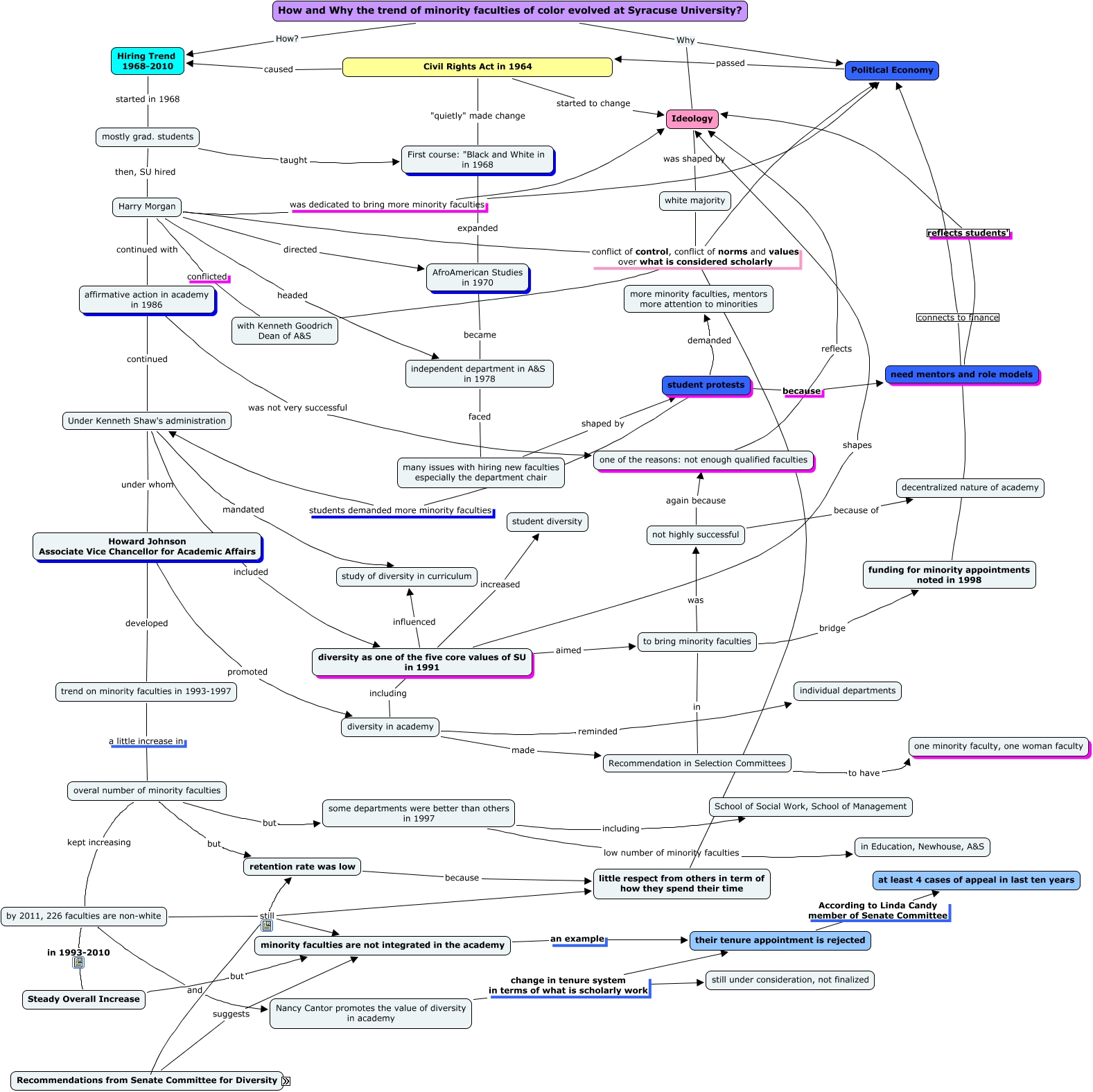 This Concept Map, created with IHMC CmapTools, has information related to: Ariunaa's CMAP, diversity in academy made Recommendation in Selection Committees, Political Economy passed Civil Rights Act in 1964, Harry Morgan headed independent department in A&S in 1978, Recommendation in Selection Committees to have one minority faculty, one woman faculty, Recommendations from Senate Committee for Diversity suggests minority faculties are not integrated in the academy, by 2011, 226 faculties are non-white still retention rate was low, Under Kenneth Shaw's administration under whom Howard Johnson Associate Vice Chancellor for Academic Affairs, by 2011, 226 faculties are non-white still Senate Committee on Diversity, Harry Morgan was dedicated to bring more minority faculties Ideology, Ideology was shaped by white majority, one of the reasons: not enough qualified faculties reflects Ideology, student protests students demanded more minority faculties Under Kenneth Shaw's administration, not highly successful because of decentralized nature of academy, Hiring Trend 1968-2010 started in 1968 mostly grad. students, Harry Morgan conflict of control, conflict of norms and values over what is considered scholarly Political Economy, diversity as one of the five core values of SU in 1991 influenced study of diversity in curriculum, overal number of minority faculties but some departments were better than others in 1997, How and Why the trend of minority faculties of color evolved at Syracuse University? Why Political Economy, affirmative action in academy in 1986 was not very successful one of the reasons: not enough qualified faculties, diversity as one of the five core values of SU in 1991 including diversity in academy