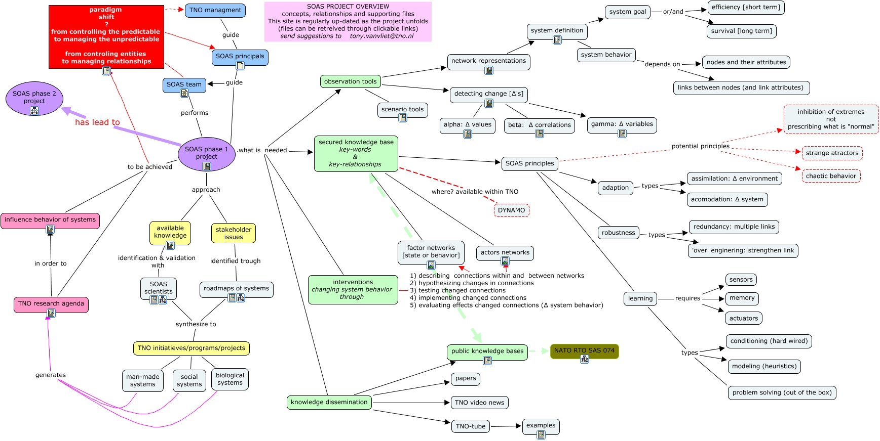 This Concept Map, created with IHMC CmapTools, has information related to: zoas overview, SOAS team performs SOAS phase 1 project, SOAS principles adaption, SOAS phase 1 project what is needed observation tools, knowledge dissemination TNO-tube, system definition system behavior, learning types conditioning (hard wired), secured knowledge base key-words & key-relationships SOAS principles, observation tools scenario tools, adaption types acomodation: ∆ system, TNO initiatieves/programs/projects man-made systems, SOAS phase 1 project to be achieved TNO research agenda, system definition system goal, paradigm shift ? from controlling the predictable to managing the unpredictable from controling entities to managing relationships SOAS principals, knowledge dissemination papers, detecting change [∆'s] gamma: ∆ variables, SOAS phase 1 project has lead to SOAS phase 2 project, detecting change [∆'s] beta: ∆ correlations, public knowledge bases NATO RTO SAS 074, observation tools network representations, SOAS principles robustness