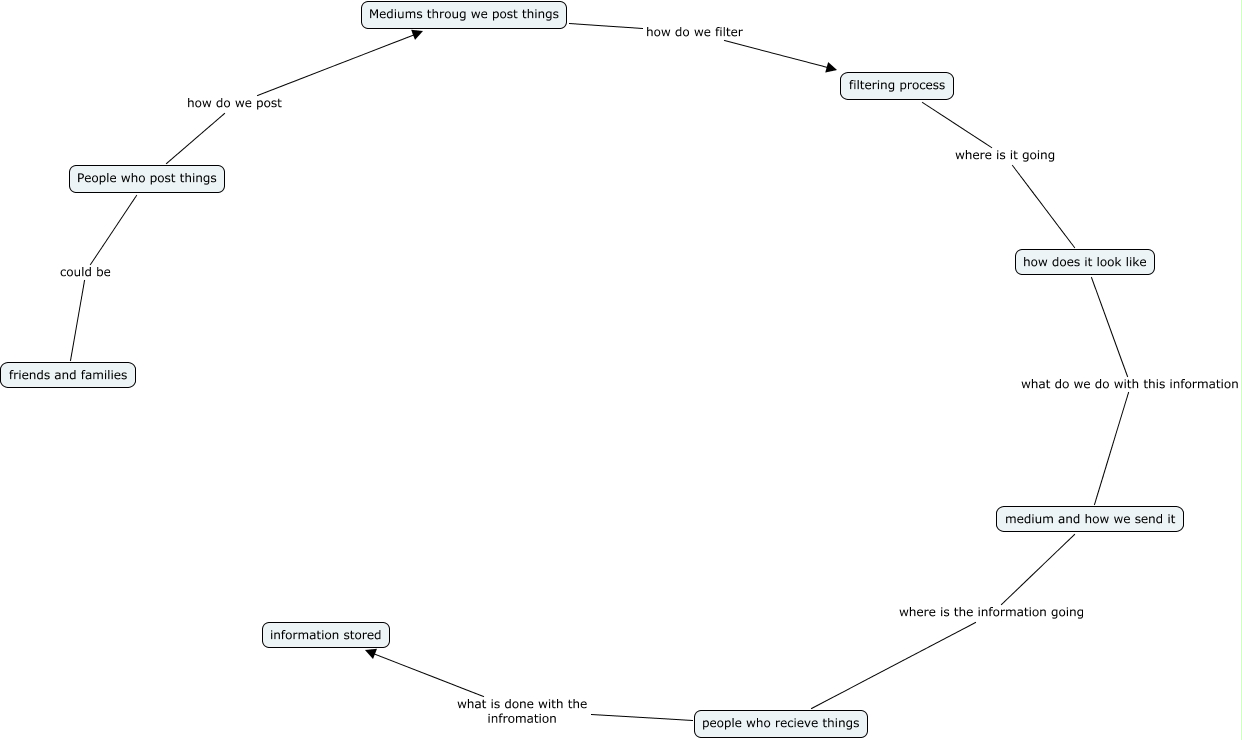 Deze Concept Map heeft informatie gerelateerd aan: Final concept, people who recieve things what is done with the infromation information stored, filtering process where is it going how does it look like, medium and how we send it where is the information going people who recieve things, People who post things how do we post Mediums throug we post things, Mediums throug we post things how do we filter filtering process, how does it look like what do we do with this information medium and how we send it, People who post things could be friends and families