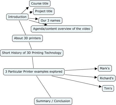 This Concept Map, created with IHMC CmapTools, has information related to: 3D Printers Video Project, Introduction Our 3 names, 3 Particular Printer examples explored Summary / Conclusion, Short History of 3D Printing Technology 3 Particular Printer examples explored, Introduction Project title, 3 Particular Printer examples explored Mark's, 3 Particular Printer examples explored Tim's, 3 Particular Printer examples explored Richard's, Introduction About 3D printers, About 3D printers Short History of 3D Printing Technology, Introduction Course title, Introduction Agenda/content overview of the video