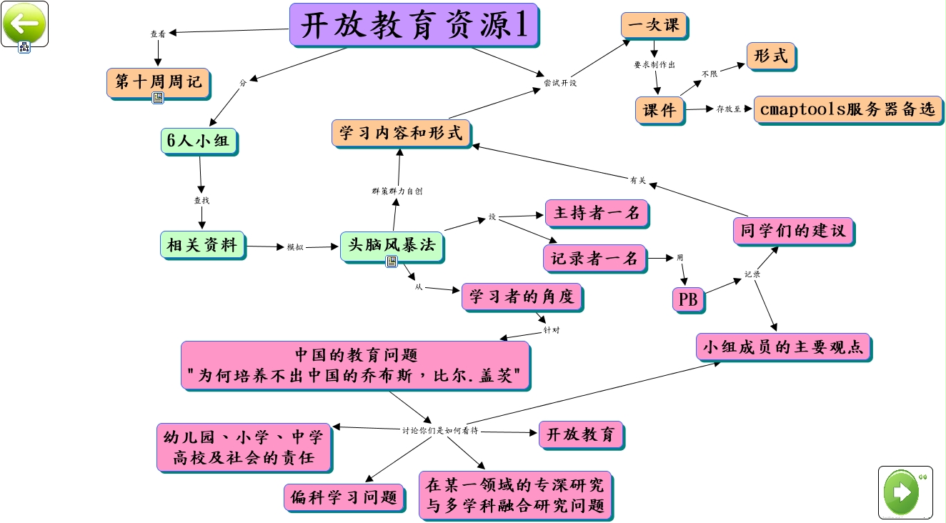 此概念图以 IHMC CmapTools 创建, 内含信息有关于: 第八专题 开放教育资源1new, 开放教育资源1 查看 第十周周记, 学习内容和形式 尝试开设 一次课, 课件 存放至 cmaptools服务器备选, 头脑风暴法 从 学习者的角度, 学习者的角度 针对 中国的教育问题 "为何培养不出中国的乔布斯,比尔.盖茨", 课件 不限 形式, PB 记录 小组成员的主要观点, 中国的教育问题 "为何培养不出中国的乔布斯,比尔.盖茨" 讨论你们是如何看待 小组成员的主要观点, 开放教育资源1 分 6人小组, PB 记录 同学们的建议, 同学们的建议 有关 学习内容和形式, 中国的教育问题 "为何培养不出中国的乔布斯,比尔.盖茨" 讨论你们是如何看待 幼儿园、小学、中学 高校及社会的责任, 头脑风暴法 设 主持者一名, 开放教育资源1 尝试开设 一次课, 头脑风暴法 群策群力自创 学习内容和形式, 中国的教育问题 "为何培养不出中国的乔布斯,比尔.盖茨" 讨论你们是如何看待 在某一领域的专深研究 与多学科融合研究问题, 头脑风暴法 设 记录者一名, 记录者一名 用 PB, 中国的教育问题 "为何培养不出中国的乔布斯,比尔.盖茨" 讨论你们是如何看待 开放教育, 相关资料 模拟 头脑风暴法