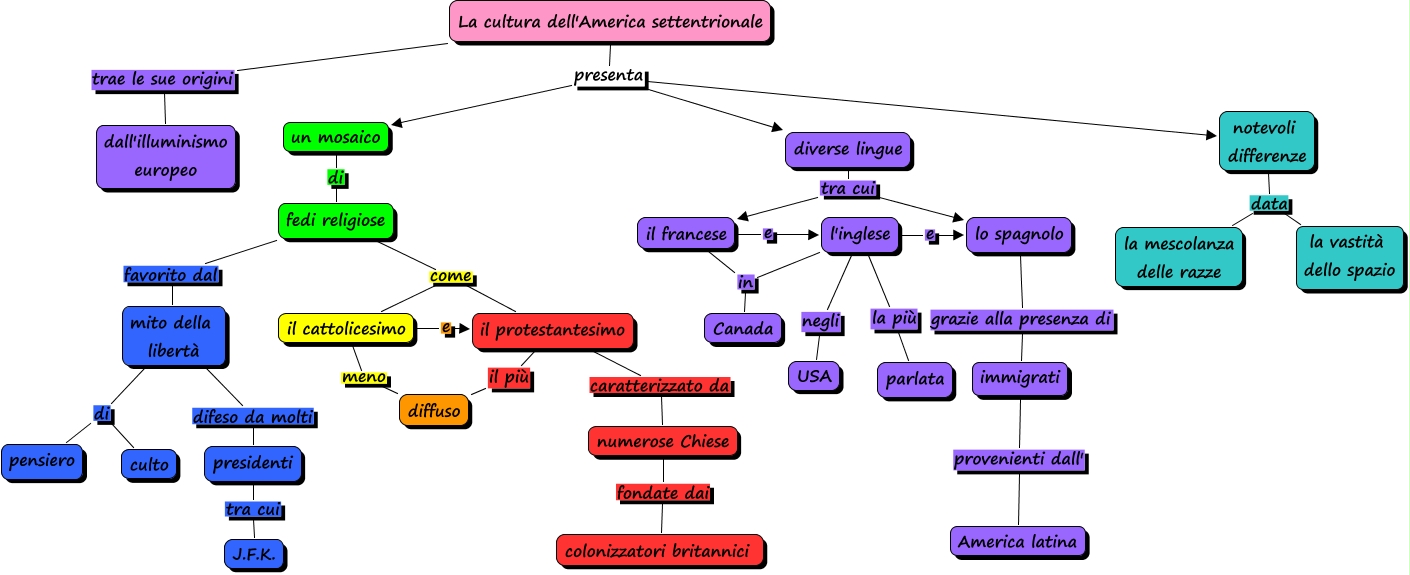 Questa Cmap, creata con IHMC CmapTools, contiene informazioni relative a: cultura_Turconi, l'inglese la più parlata, notevoli differenze data la vastità dello spazio, il cattolicesimo meno diffuso, fedi religiose favorito dal mito della libertà, l'inglese negli USA, il francese e l'inglese, numerose Chiese fondate dai colonizzatori britannici, lo spagnolo grazie alla presenza di immigrati, fedi religiose come il cattolicesimo, diverse lingue tra cui lo spagnolo, l'inglese e lo spagnolo, notevoli differenze data la mescolanza delle razze, La cultura dell'America settentrionale presenta notevoli differenze, diverse lingue tra cui il francese, La cultura dell'America settentrionale presenta un mosaico, il protestantesimo il più diffuso, fedi religiose come il protestantesimo, La cultura dell'America settentrionale trae le sue origini dall'illuminismo europeo, il cattolicesimo e il protestantesimo, mito della libertà difeso da molti presidenti