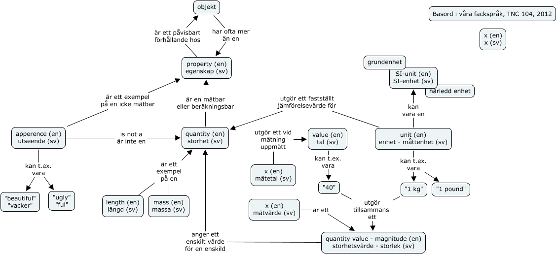 Den här kartan innehåller information om: property, value (en) tal (sv) kan t.ex. vara "40", apperence (en) utseende (sv) is not a är inte en quantity (en) storhet (sv), apperence (en) utseende (sv) kan t.ex. vara "ugly" "ful", objekt har ofta mer än en property (en) egenskap (sv), apperence (en) utseende (sv) är ett exempel på en icke mätbar property (en) egenskap (sv), mass (en) massa (sv) är ett exempel på en quantity (en) storhet (sv), x (en) mätvärde (sv) är ett quantity value - magnitude (en) storhetsvärde - storlek (sv), quantity value - magnitude (en) storhetsvärde - storlek (sv) anger ett enskilt värde för en enskild quantity (en) storhet (sv), property (en) egenskap (sv) är ett påvisbart förhållande hos objekt, apperence (en) utseende (sv) kan t.ex. vara "beautiful" "vacker", "1 kg" utgör tillsammans ett quantity value - magnitude (en) storhetsvärde - storlek (sv), quantity (en) storhet (sv) är en mätbar eller beräkningsbar property (en) egenskap (sv), unit (en) enhet - måttenhet (sv) kan t.ex. vara "1 pound", unit (en) enhet - måttenhet (sv) kan vara en SI-unit (en) SI-enhet (sv), unit (en) enhet - måttenhet (sv) utgör ett fastställt jämförelsevärde för quantity (en) storhet (sv), "40" utgör tillsammans ett quantity value - magnitude (en) storhetsvärde - storlek (sv), unit (en) enhet - måttenhet (sv) kan t.ex. vara "1 kg", x (en) mätetal (sv) utgör ett vid mätning uppmätt value (en) tal (sv), length (en) längd (sv) är ett exempel på en quantity (en) storhet (sv)
