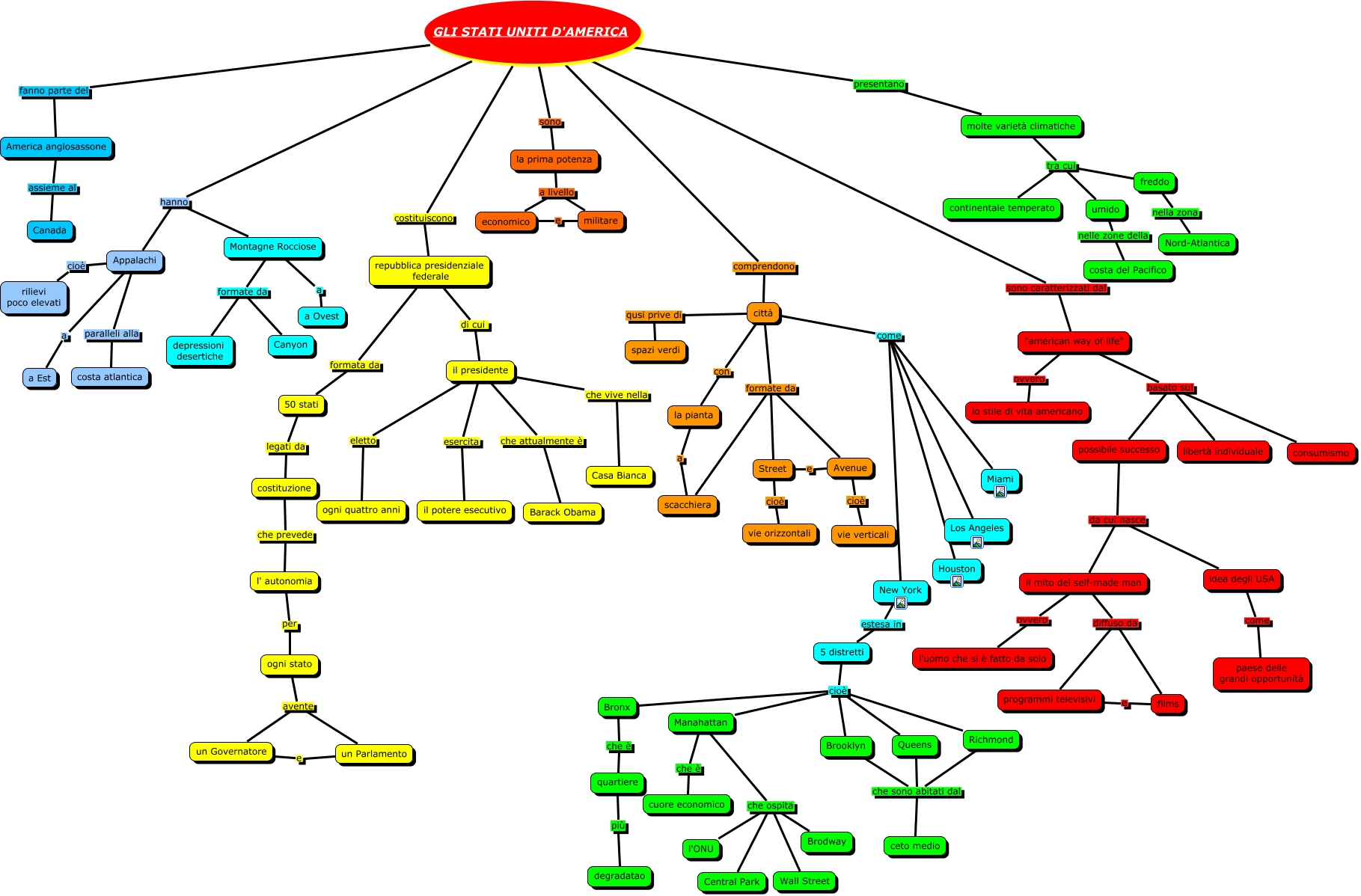 Questa Cmap, creata con IHMC CmapTools, contiene informazioni relative a: Stati uniti d'America_Scalia, repubblica presidenziale federale di cui il presidente, "american way of life" ovvero lo stile di vita americano, Brooklyn che sono abitati dal ceto medio, il mito del self-made man diffuso da programmi televisivi, 5 distretti cioè Queens, il presidente eletto ogni quattro anni, America anglosassone assieme al Canada, molte varietà climatiche tra cui umido, la prima potenza a livello militare, scacchiera formate da Street, New York estesa in 5 distretti, freddo nella zona Nord-Atlantica, ogni stato avente un Parlamento, umido nelle zone della costa del Pacifico, GLI STATI UNITI D'AMERICA costituiscono repubblica presidenziale federale, la pianta a scacchiera, Appalachi cioè rilievi poco elevati, possibile successo da cui nasce il mito del self-made man, Queens che sono abitati dal ceto medio, Appalachi paralleli alla costa atlantica