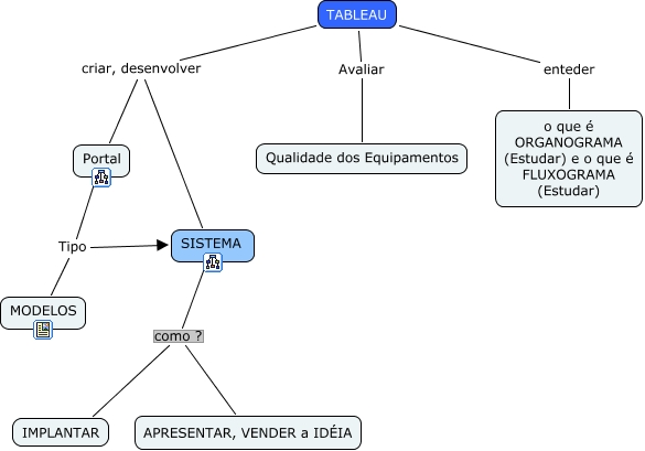 Esse mapa conceitual, produzido no IHMC CmapTools, tem a informação relacionada a: Tableau, Portal Tipo MODELOS, TABLEAU Avaliar Qualidade dos Equipamentos, Portal Tipo SISTEMA, TABLEAU criar, desenvolver Portal, SISTEMA como ? APRESENTAR, VENDER a IDÉIA, TABLEAU criar, desenvolver SISTEMA, TABLEAU enteder o que é ORGANOGRAMA (Estudar) e o que é FLUXOGRAMA (Estudar), SISTEMA como ? IMPLANTAR