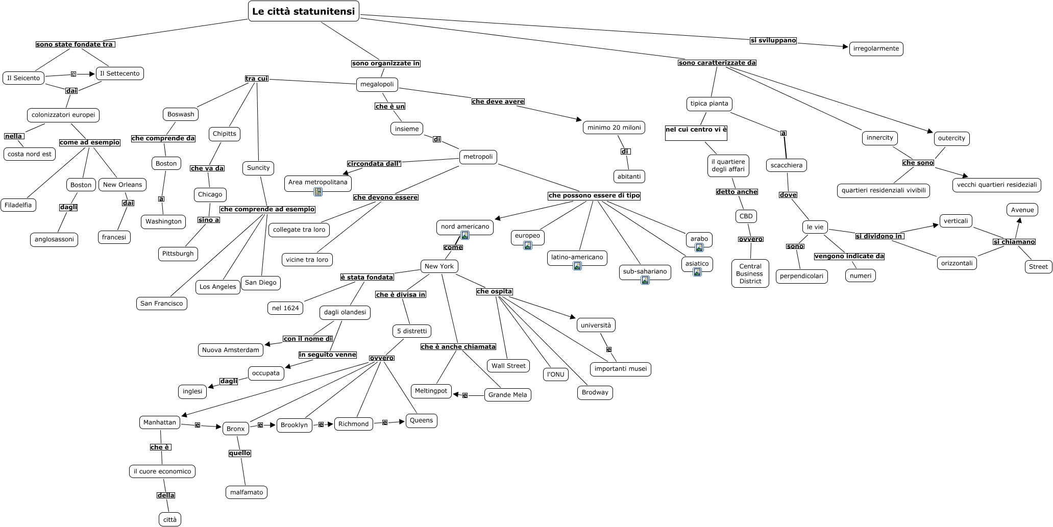 Questa Cmap, creata con IHMC CmapTools, contiene informazioni relative a: _Le città statunitensi_, dagli olandesi in seguito venne occupata, Bronx e Brooklyn, scacchiera dove le vie, Le città statunitensi sono state fondate tra Il Settecento, metropoli che possono essere di tipo asiatico, innercity che sono vecchi quartieri resideziali, 5 distretti ovvero Manhattan, il cuore economico della città, colonizzatori europei come ad esempio Filadelfia, le vie sono perpendicolari, megalopoli tra cui Suncity, New York che è anche chiamata Meltingpot, Boston dagli anglosassoni, New York che ospita Wall Street, Il Seicento e Il Settecento, CBD ovvero Central Business District, verticali si chiamano Avenue, Suncity che comprende ad esempio Los Angeles, metropoli che devono essere vicine tra loro, 5 distretti ovvero Queens