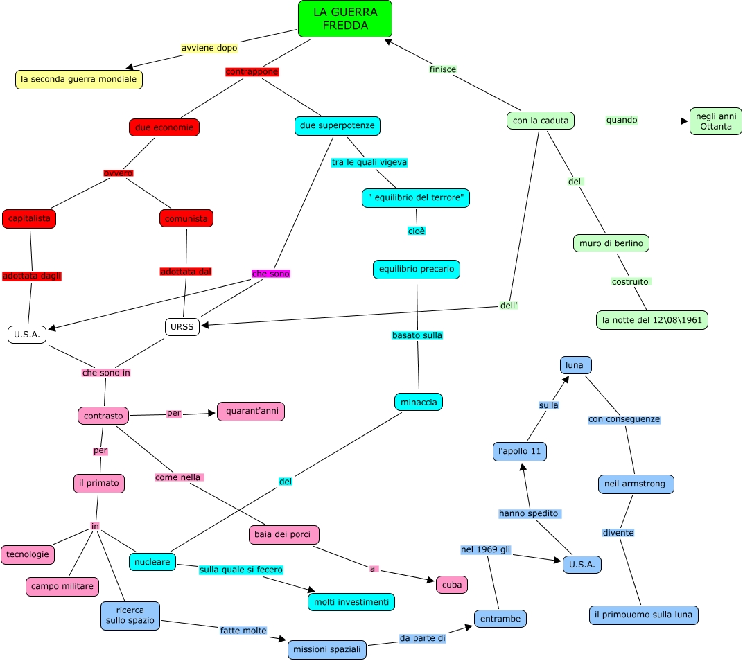 Questa Cmap, creata con IHMC CmapTools, contiene informazioni relative a: Guerra_Fredda_Rossini, LA GUERRA FREDDA contrappone due economie, ricerca sullo spazio fatte molte missioni spaziali, comunista adottata dal URSS, il primato in campo militare, entrambe nel 1969 gli U.S.A., con la caduta del muro di berlino, due superpotenze che sono U.S.A., contrasto per quarant'anni, LA GUERRA FREDDA avviene dopo la seconda guerra mondiale, capitalista adottata dagli U.S.A., luna con conseguenze neil armstrong, baia dei porci a cuba, " equilibrio del terrore" cioè equilibrio precario, due economie ovvero capitalista, due economie ovvero comunista, U.S.A. che sono in contrasto, il primato in tecnologie, muro di berlino costruito la notte del 12\08\1961, nucleare sulla quale si fecero molti investimenti, il primato in nucleare