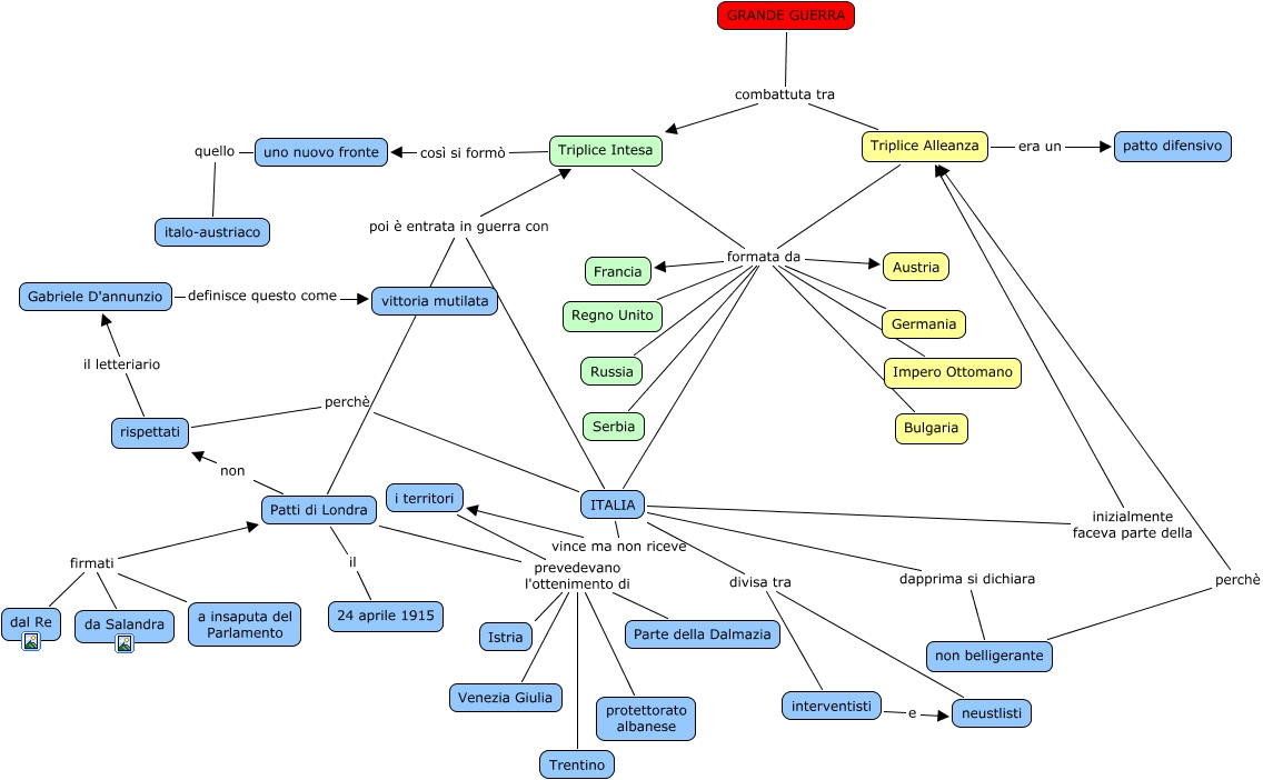 Questa Cmap, creata con IHMC CmapTools, contiene informazioni relative a: Grande Guerra_Marzolo, da Salandra firmati a insaputa del Parlamento, ITALIA dapprima si dichiara non belligerante, Gabriele D'annunzio definisce questo come vittoria mutilata, Patti di Londra prevedevano l'ottenimento di Venezia Giulia, ITALIA vince ma non riceve i territori, Triplice Intesa formata da Austria, i territori prevedevano l'ottenimento di Trentino, interventisti e neustlisti, Triplice Alleanza formata da Germania, Triplice Intesa formata da Regno Unito, Triplice Alleanza formata da Austria, Triplice Intesa formata da Francia, i territori prevedevano l'ottenimento di protettorato albanese, Triplice Intesa formata da Bulgaria, Triplice Alleanza formata da ITALIA, Patti di Londra prevedevano l'ottenimento di Istria, rispettati perchè ITALIA, Patti di Londra non rispettati, Patti di Londra prevedevano l'ottenimento di Parte della Dalmazia, i territori prevedevano l'ottenimento di Venezia Giulia
