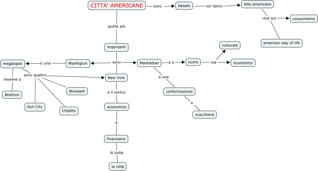 Questa Cmap, creata con IHMC CmapTools, contiene informazioni relative a: città americane, megalopoli sono quattro New York, CITTA' AMERICANE quelle più importanti, New York è il centro economico, conformazione a scacchiera, importanti sono Washigton, stile americano cioè sul american way of life, finanziario di tutta la città, Manhattan è il cuore, basate sul tipico stile americano, megalopoli sono quattro Chipitts, importanti sono Manhattan, Manhattan a una conformazione, CITTA' AMERICANE sono basate, megalopoli insieme a Bosthon, cuore sia culturale, importanti sono New York, megalopoli sono quattro Boswash, cuore sia economico, economico e finanziario, megalopoli sono quattro Sun City