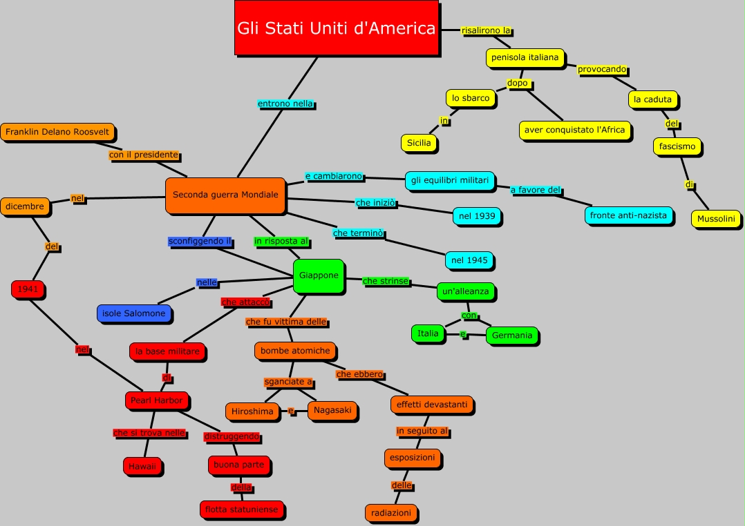 Questa Cmap, creata con IHMC CmapTools, contiene informazioni relative a: Ingresso in guerra USA_Scalia, penisola italiana dopo aver conquistato l'Africa, lo sbarco in Sicilia, Gli Stati Uniti d'America risalirono la penisola italiana, Giappone che attaccò la base militare, Seconda guerra Mondiale sconfiggendo il Giappone, Seconda guerra Mondiale che iniziò nel 1939, bombe atomiche sganciate a Hiroshima, bombe atomiche che ebbero effetti devastanti, esposizioni delle radiazioni, Giappone che fu vittima delle bombe atomiche, bombe atomiche sganciate a Nagasaki, fascismo di Mussolini, un'alleanza con Germania, Pearl Harbor nel 1941, Seconda guerra Mondiale con il presidente Franklin Delano Roosvelt, penisola italiana provocando la caduta, Giappone che strinse un'alleanza, Pearl Harbor distruggendo buona parte, Seconda guerra Mondiale nel dicembre, Pearl Harbor che si trova nelle Hawaii
