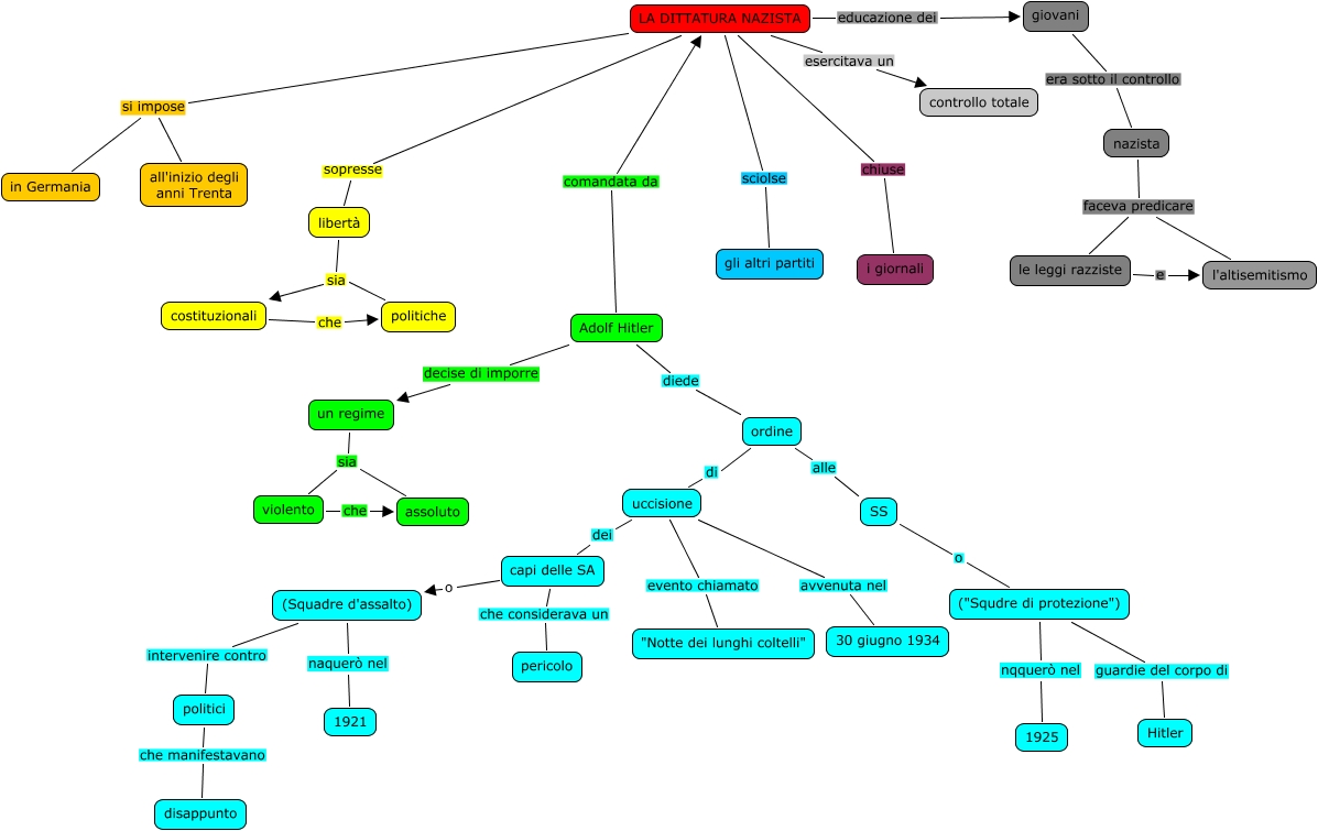 Questa Cmap, creata con IHMC CmapTools, contiene informazioni relative a: Il_regime_Nazista_Marzolo, uccisione avvenuta nel 30 giugno 1934, nazista faceva predicare le leggi razziste, un regime sia violento, giovani era sotto il controllo nazista, costituzionali che politiche, LA DITTATURA NAZISTA sciolse gli altri partiti, nazista faceva predicare l'altisemitismo, LA DITTATURA NAZISTA sopresse libertà, Adolf Hitler diede ordine, capi delle SA che considerava un pericolo, SS o ("Squdre di protezione"), LA DITTATURA NAZISTA educazione dei giovani, Adolf Hitler decise di imporre un regime, ("Squdre di protezione") guardie del corpo di Hitler, libertà sia costituzionali, (Squadre d'assalto) intervenire contro politici, LA DITTATURA NAZISTA si impose all'inizio degli anni Trenta, LA DITTATURA NAZISTA chiuse i giornali, (Squadre d'assalto) naquerò nel 1921, ordine di uccisione