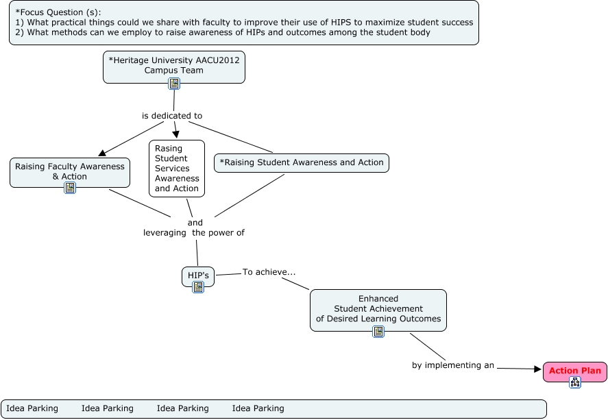 This Concept Map, created with IHMC CmapTools, has information related to: HeritageAACU2012, Rasing Student Services Awareness and Action and leveraging the power of Raising Faculty Awareness & Action, *Heritage University AACU2012 Campus Team is dedicated to Raising Faculty Awareness & Action, *Heritage University AACU2012 Campus Team is dedicated to Rasing Student Services Awareness and Action, HIP's To achieve... Enhanced Student Achievement of Desired Learning Outcomes, Enhanced Student Achievement of Desired Learning Outcomes by implementing an Action Plan, HIP's and leveraging the power of Raising Faculty Awareness & Action, Rasing Student Services Awareness and Action and leveraging the power of *Raising Student Awareness and Action, *Heritage University AACU2012 Campus Team is dedicated to *Raising Student Awareness and Action, HIP's and leveraging the power of *Raising Student Awareness and Action