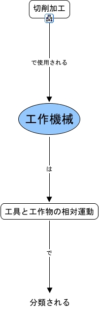 このコンセプトマップに関連する情報: 工作機械, 工具と工作物の相対運動 で 分類される, 切削加工 で使用される 工作機械, 工作機械 は 工具と工作物の相対運動