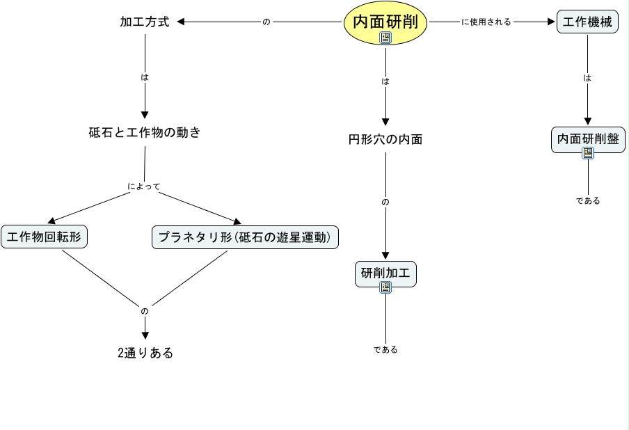 このコンセプトマップに関連する情報: 内面研削, 内面研削 は 円形穴の内面, 工作機械 は 内面研削盤, 内面研削 に使用される 工作機械, 円形穴の内面 の 研削加工, 研削加工 である ????, 加工方式 は 砥石と工作物の動き, 砥石と工作物の動き によって 工作物回転形, 砥石と工作物の動き によって プラネタリ形(砥石の遊星運動), 内面研削 の 加工方式, 内面研削盤 である ????, プラネタリ形(砥石の遊星運動) の 2通りある, 工作物回転形 の 2通りある