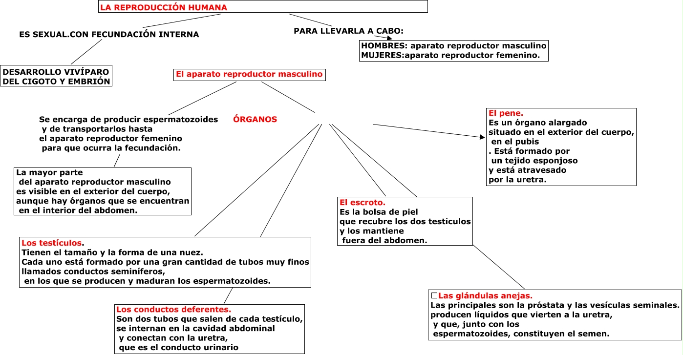 Este Cmap, tiene información relacionada con: REPRODUCCION HUMANA APARATOMASCULINO, El aparato reproductor masculino ÓRGANOS Los testículos. Tienen el tamaño y la forma de una nuez. Cada uno está formado por una gran cantidad de tubos muy finos llamados conductos seminíferos, en los que se producen y maduran los espermatozoides., El aparato reproductor masculino ÓRGANOS Las glándulas anejas. Las principales son la próstata y las vesículas seminales. producen líquidos que vierten a la uretra, y que, junto con los espermatozoides, constituyen el semen., El aparato reproductor masculino ÓRGANOS Los conductos deferentes. Son dos tubos que salen de cada testículo, se internan en la cavidad abdominal y conectan con la uretra, que es el conducto urinario, El aparato reproductor masculino ÓRGANOS El escroto. Es la bolsa de piel que recubre los dos testículos y los mantiene fuera del abdomen., LA REPRODUCCIÓN HUMANA PARA LLEVARLA A CABO: HOMBRES: aparato reproductor masculino MUJERES:aparato reproductor femenino., El aparato reproductor masculino Se encarga de producir espermatozoides y de transportarlos hasta el aparato reproductor femenino para que ocurra la fecundación. La mayor parte del aparato reproductor masculino es visible en el exterior del cuerpo, aunque hay órganos que se encuentran en el interior del abdomen., LA REPRODUCCIÓN HUMANA ES SEXUAL.CON FECUNDACIÓN INTERNA DESARROLLO VIVÍPARO DEL CIGOTO Y EMBRIÓN, El aparato reproductor masculino ÓRGANOS El pene. Es un órgano alargado situado en el exterior del cuerpo, en el pubis . Está formado por un tejido esponjoso y está atravesado por la uretra.