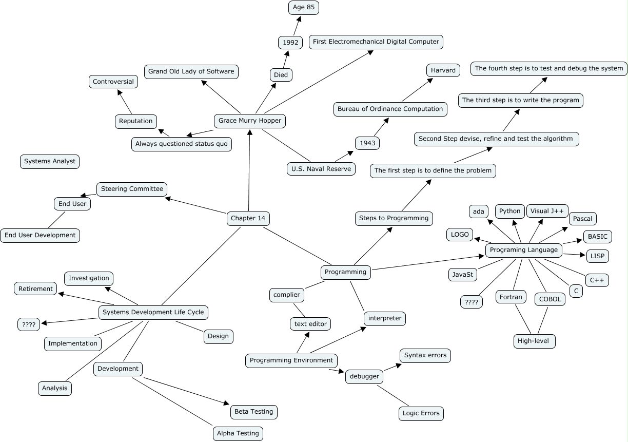 This Concept Map, created with IHMC CmapTools, has information related to: team 03, The third step is to write the program The fourth step is to test and debug the system, Grace Murry Hopper U.S. Naval Reserve, Programming Programing Language, Development Alpha Testing, Grace Murry Hopper First Electromechanical Digital Computer, Programing Language Python, debugger Logic Errors, Systems Development Life Cycle Investigation, Programing Language Fortran, Grace Murry Hopper Always questioned status quo, complier text editor, Programing Language C++, Systems Development Life Cycle Development, Chapter 14 Steering Committee, Programming Environment debugger, Systems Development Life Cycle Implementation, Steps to Programming The first step is to define the problem, COBOL High-level, Systems Development Life Cycle ????, Second Step devise, refine and test the algorithm The third step is to write the program
