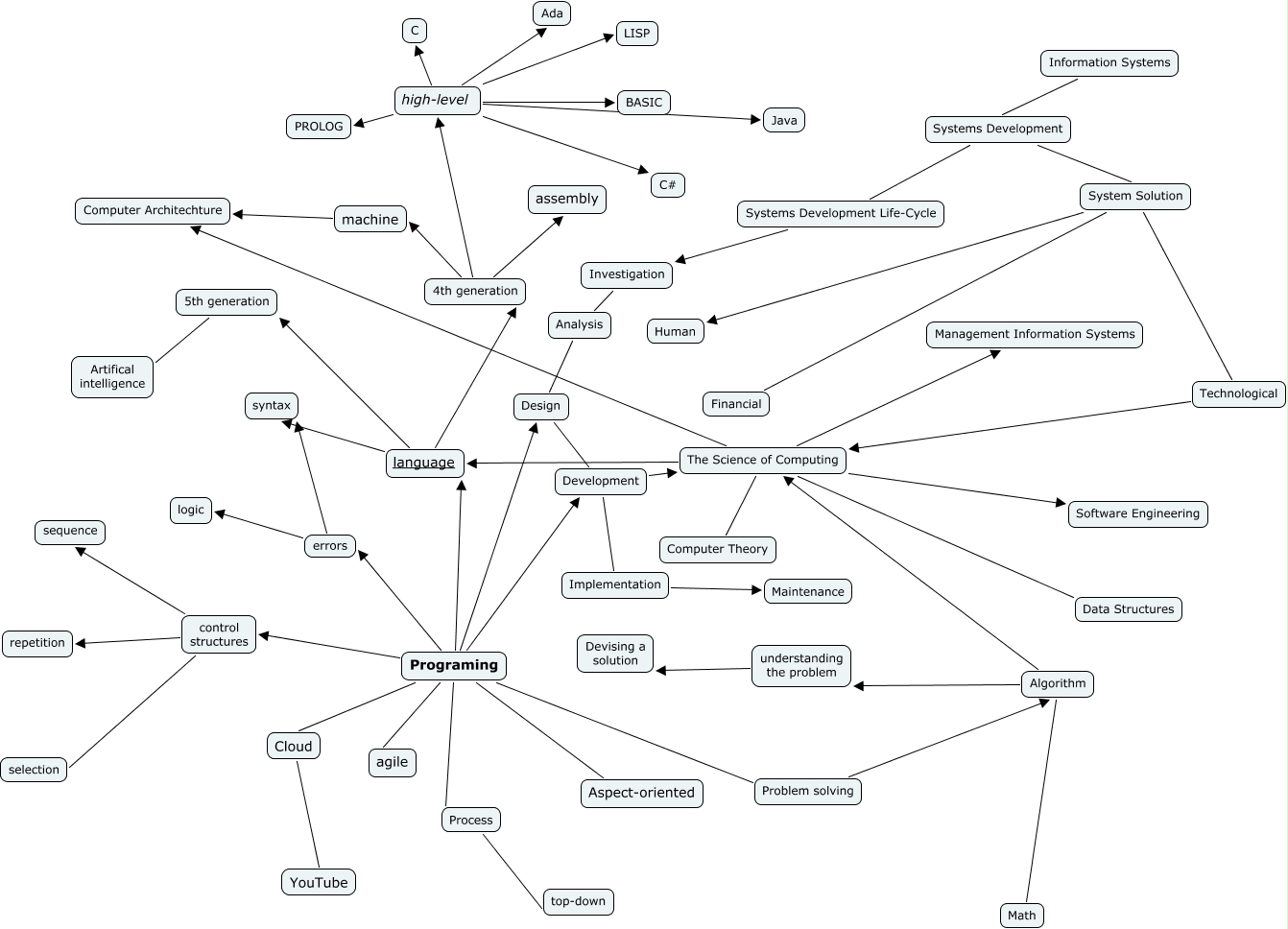 This Concept Map, created with IHMC CmapTools, has information related to: team 01, Programing Problem solving, Cloud YouTube, Systems Development System Solution, errors logic, Process top-down, machine Computer Architechture, Information Systems Systems Development, errors syntax, high-level C#, The Science of Computing Computer Theory, Design Development, Programing Aspect-oriented, Programing control structures, high-level PROLOG, The Science of Computing language, high-level Java, System Solution Financial, control structures repetition, Algorithm The Science of Computing, Programing Development