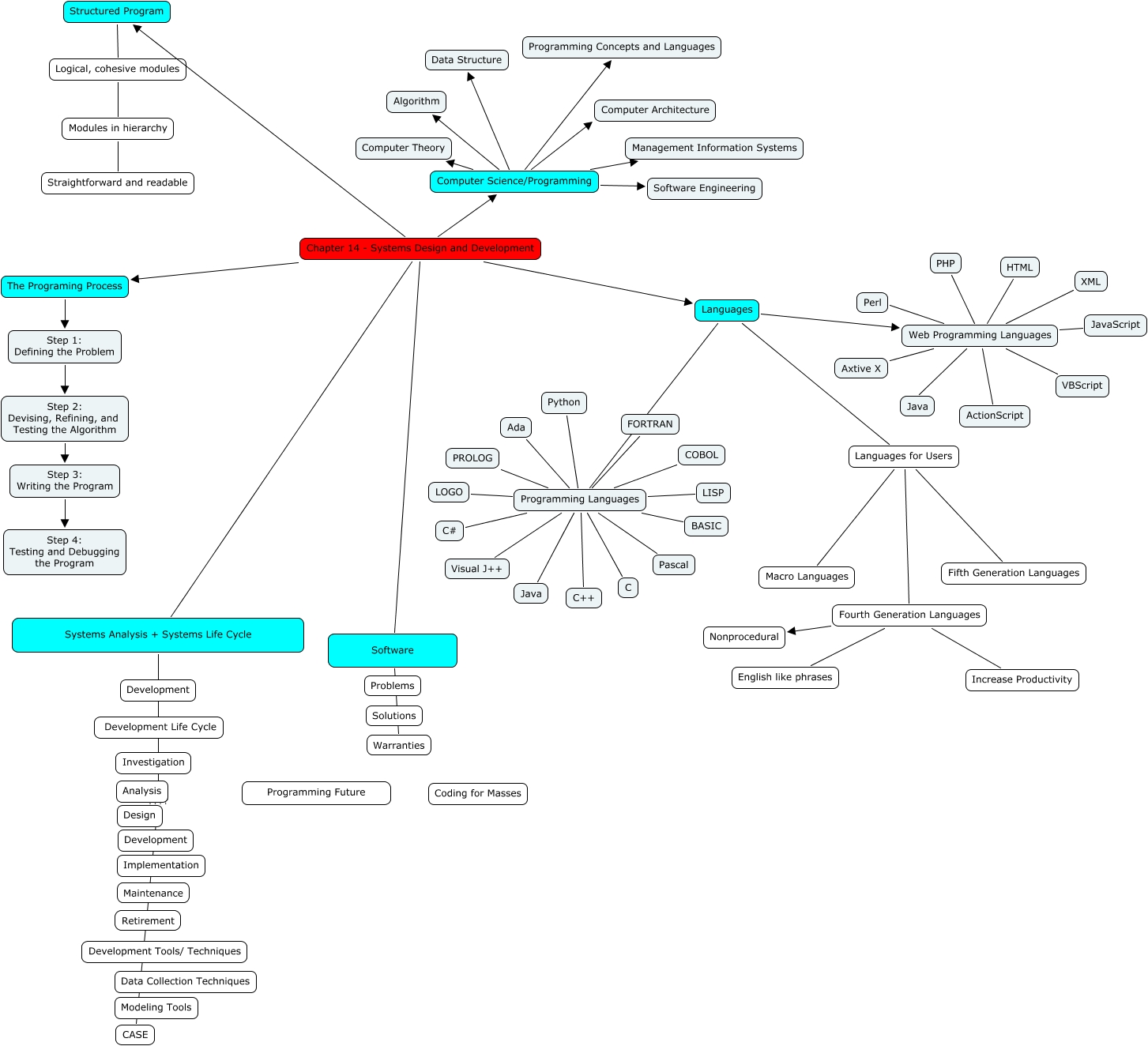 This Concept Map, created with IHMC CmapTools, has information related to: Team 05, Chapter 14 - Systems Design and Development Software, Programming Languages BASIC, Languages Programming Languages, Web Programming Languages HTML, Chapter 14 - Systems Design and Development Computer Science/Programming, Web Programming Languages ActionScript, Web Programming Languages PHP, Computer Science/Programming Programming Concepts and Languages, Computer Science/Programming Management Information Systems, Programming Languages Java, Computer Science/Programming Computer Theory, Programming Languages C, Web Programming Languages Perl, Computer Science/Programming Data Structure, Fourth Generation Languages Increase Productivity, Logical, cohesive modules Modules in hierarchy, Fourth Generation Languages Nonprocedural, Chapter 14 - Systems Design and Development The Programing Process, Programming Languages C++, Programming Languages FORTRAN
