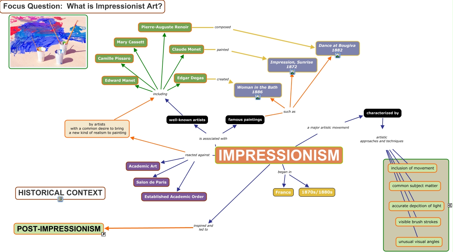 This Concept Map, created with IHMC CmapTools, has information related to: cmap2, by artists with a common desire to bring a new kind of realism to painting including Camille Pissaro, by artists with a common desire to bring a new kind of realism to painting including Claude Monet, IMPRESSIONISM began in France, by artists with a common desire to bring a new kind of realism to painting including Edward Manet, Claude Monet painted Impression, Sunrise 1872, famous paintings such as Woman in the Bath 1886, Pierre-Auguste Renoir composed Dance at Bougiva 1882, well-known artists including Edward Manet, well-known artists including Mary Cassett, well-known artists including Edgar Degas, IMPRESSIONISM began in 1870s/1880s, well-known artists including Pierre-Auguste Renoir, well-known artists including Claude Monet, well-known artists including Camille Pissaro, famous paintings such as Dance at Bougiva 1882, IMPRESSIONISM reacted against Salon de Paris, by artists with a common desire to bring a new kind of realism to painting including Mary Cassett, characterized by artistic approaches and techniques unusual visual angles, IMPRESSIONISM inspired and led to POST-IMPRESSIONISM, Edgar Degas created Woman in the Bath 1886