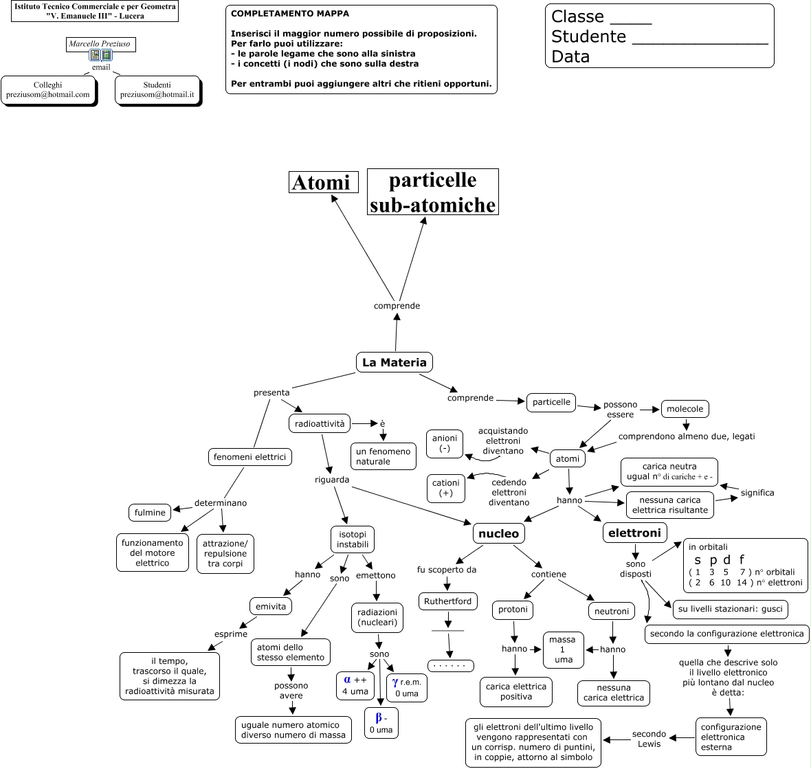 Questa Cmap, creata con IHMC CmapTools, contiene informazioni relative a: Atomi e particelle subatomiche, atomi acquistando elettroni diventano anioni (-), neutroni hanno nessuna carica elettrica, radioattività riguarda isotopi instabili, fenomeni elettrici determinano fulmine, particelle possono essere molecole, fenomeni elettrici determinano funzionamento del motore elettrico, radiazioni (nucleari) sono β - 0 uma, radiazioni (nucleari) sono γ r.e.m. 0 uma, configurazione elettronica esterna secondo Lewis gli elettroni dell'ultimo livello vengono rappresentati con un corrisp. numero di puntini, in coppie, attorno al simbolo, protoni hanno massa 1 uma, radioattività riguarda nucleo, particelle possono essere atomi, protoni hanno carica elettrica positiva, radiazioni (nucleari) sono α ++ 4 uma, nucleo contiene neutroni, nucleo contiene protoni, radioattività è un fenomeno naturale, isotopi instabili sono atomi dello stesso elemento, fenomeni elettrici determinano attrazione/ repulsione tra corpi, Ruthertford . . . . . . . . . . . .