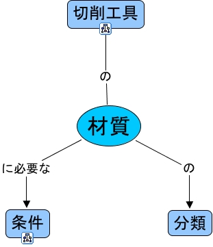 このコンセプトマップに関連する情報: 切削工具の材質, 切削工具 の 材質, 材質 に必要な 条件, 材質 の 分類
