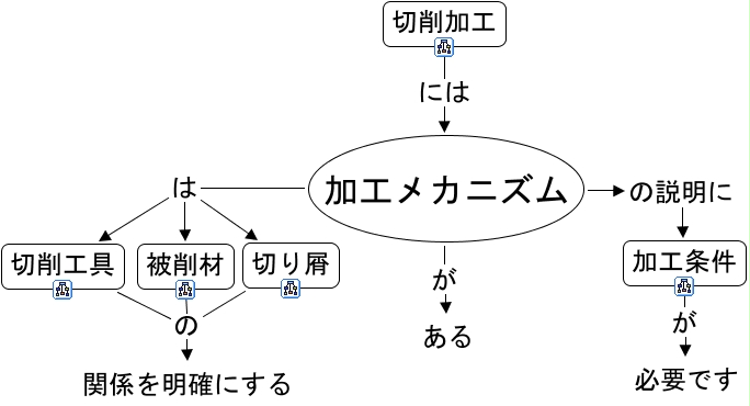 このコンセプトマップに関連する情報: 切削加工の加工メカニズム, 加工条件 が 必要です, 切削工具 の 関係を明確にする, 切削加工 には 加工メカニズム, 切り屑 の 関係を明確にする, 加工メカニズム は 被削材, 加工メカニズム が ある, 被削材 の 関係を明確にする, 加工メカニズム は 切り屑, 加工メカニズム の説明に 加工条件, 加工メカニズム は 切削工具