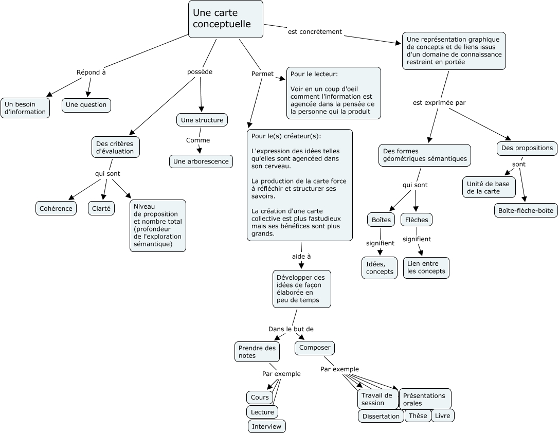 Cette carte de concepts créée avec IHMC CmapTools traite de: Qu est ce qu une Carte conceptuelle, Des propositions sont Unité de base de la carte, Une carte conceptuelle Répond à Un besoin d'information, Boîtes signifient Idées, concepts, Une carte conceptuelle est concrètement Une représentation graphique de concepts et de liens issus d'un domaine de connaissance restreint en portée, Composer Par exemple Présentations orales, Une carte conceptuelle Permet Pour le lecteur: Voir en un coup d'oeil comment l'information est agencée dans la pensée de la personne qui la produit, Une carte conceptuelle possède Des critères d'évaluation, Une représentation graphique de concepts et de liens issus d'un domaine de connaissance restreint en portée est exprimée par Des propositions, Flèches signifient Lien entre les concepts, Composer Par exemple Livre, Des propositions sont Boîte-flèche-boîte, Composer Par exemple Travail de session, Composer Par exemple Thèse, Pour le(s) créateur(s): L'expression des idées telles qu'elles sont agencéed dans son cerveau. La production de la carte force à réfléchir et structurer ses savoirs. La création d'une carte collective est plus fastudieux mais ses bénéfices sont plus grands. aide à Développer des idées de façon élaborée en peu de temps, Des critères d'évaluation qui sont Niveau de proposition et nombre total (profondeur de l'exploration sémantique), Prendre des notes Par exemple Interview, Développer des idées de façon élaborée en peu de temps Dans le but de Prendre des notes, Une carte conceptuelle Répond à Une question, Composer Par exemple Dissertation, Une carte conceptuelle possède Une structure