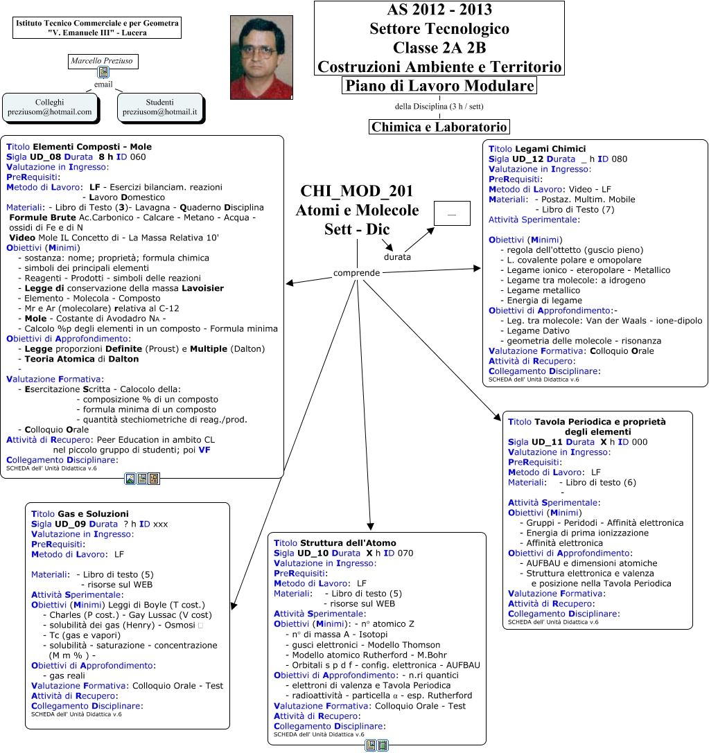 Questa Cmap, creata con IHMC CmapTools, contiene informazioni relative a: CHI_MOD_201 Atomi e Molecole - Sett - Nov, Marcello Preziuso email Colleghi preziusom@hotmail.com, CHI_MOD_201 Atomi e Molecole Sett - Dic comprende Titolo Tavola Periodica e proprietà degli elementi Sigla UD_11 Durata X h ID 000 Valutazione in Ingresso: PreRequisiti: Metodo di Lavoro: LF Materiali: - Libro di testo (6) - Attività Sperimentale: Obiettivi (Minimi) - Gruppi - Peridodi - Affinità elettronica - Energia di prima ionizzazione - Affinità elettronica Obiettivi di Approfondimento: - AUFBAU e dimensioni atomiche - Struttura elettronica e valenza e posizione nella Tavola Periodica Valutazione Formativa: Attività di Recupero: Collegamento Disciplinare: SCHEDA dell' Unità Didattica v.6, CHI_MOD_201 Atomi e Molecole Sett - Dic comprende Titolo Legami Chimici Sigla UD_12 Durata _ h ID 080 Valutazione in Ingresso: PreRequisiti: Metodo di Lavoro: Video - LF Materiali: - Postaz. Multim. Mobile - Libro di Testo (7) Attività Sperimentale: Obiettivi (Minimi) - regola dell'ottetto (guscio pieno) - L. covalente polare e omopolare - Legame ionico - eteropolare - Metallico - Legame tra molecole: a idrogeno - Legame metallico - Energia di legame Obiettivi di Approfondimento:- - Leg. tra molecole: Van der Waals - ione-dipolo - Legame Dativo - geometria delle molecole - risonanza Valutazione Formativa: Colloquio Orale Attività di Recupero: Collegamento Disciplinare: SCHEDA dell' Unità Didattica v.6, CHI_MOD_201 Atomi e Molecole Sett - Dic comprende Titolo Struttura dell'Atomo Sigla UD_10 Durata X h ID 070 Valutazione in Ingresso: PreRequisiti: Metodo di Lavoro: LF Materiali: - Libro di testo (5) - risorse sul WEB Attività Sperimentale: Obiettivi (Minimi): - n° atomico Z - n° di massa A - Isotopi - gusci elettronici - Modello Thomson - Modello atomico Rutherford - M.Bohr - Orbitali s p d f - config. elettronica - AUFBAU Obiettivi di Approfondimento: - n.ri quantici - elettroni di valenza e Tavola Periodica - radioattività - particella α - esp. Rutherford Valutazione Formativa: Colloquio Orale - Test Attività di Recupero: Collegamento Disciplinare: SCHEDA dell' Unità Didattica v.6, CHI_MOD_201 Atomi e Molecole Sett - Dic comprende Titolo Elementi Composti - Mole Sigla UD_08 Durata 8 h ID 060 Valutazione in Ingresso: PreRequisiti: Metodo di Lavoro: LF - Esercizi bilanciam. reazioni - Lavoro Domestico Materiali: - Libro di Testo (3)- Lavagna - Quaderno Disciplina Formule Brute Ac.Carbonico - Calcare - Metano - Acqua - ossidi di Fe e di N Video Mole IL Concetto di - La Massa Relativa 10' Obiettivi (Minimi) - sostanza: nome; proprietà; formula chimica - simboli dei principali elementi - Reagenti - Prodotti - simboli delle reazioni - Legge di conservazione della massa Lavoisier - Elemento - Molecola - Composto - Mr e Ar (molecolare) relativa al C-12 - Mole - Costante di Avodadro NA - - Calcolo %p degli elementi in un composto - Formula minima Obiettivi di Approfondimento: - Legge proporzioni Definite (Proust) e Multiple (Dalton) - Teoria Atomica di Dalton - Valutazione Formativa: - Esercitazione Scritta - Calocolo della: - composizione % di un composto - formula minima di un composto - quantità stechiometriche di reag./prod. - Colloquio Orale Attività di Recupero: Peer Education in ambito CL nel piccolo gruppo di studenti; poi VF Collegamento Disciplinare: SCHEDA dell' Unità Didattica v.6, CHI_MOD_201 Atomi e Molecole Sett - Dic durata __, CHI_MOD_201 Atomi e Molecole Sett - Dic comprende Titolo Gas e Soluzioni Sigla UD_09 Durata ? h ID xxx Valutazione in Ingresso: PreRequisiti: Metodo di Lavoro: LF Materiali: - Libro di testo (5) - risorse sul WEB Attività Sperimentale: Obiettivi (Minimi) Leggi di Boyle (T cost.) - Charles (P cost.) - Gay Lussac (V cost) - solubilità dei gas (Henry) - Osmosi p - Tc (gas e vapori) - solubilità - saturazione - concentrazione (M m % ) - Obiettivi di Approfondimento: - gas reali Valutazione Formativa: Colloquio Orale - Test Attività di Recupero: Collegamento Disciplinare: SCHEDA dell' Unità Didattica v.6, Marcello Preziuso email Studenti preziusom@hotmail.it, Piano di Lavoro Modulare della Disciplina (3 h / sett) Chimica e Laboratorio