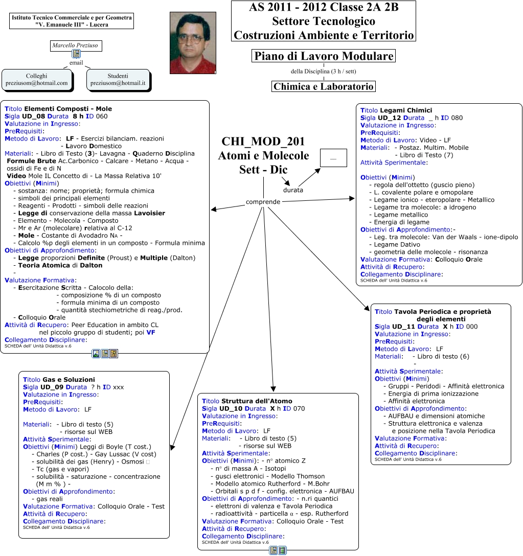 Questa Cmap, creata con IHMC CmapTools, contiene informazioni relative a: CHI_MOD_201 Atomi e Molecole - Sett - Nov, Marcello Preziuso email Colleghi preziusom@hotmail.com, CHI_MOD_201 Atomi e Molecole Sett - Dic comprende Titolo Tavola Periodica e proprietà degli elementi Sigla UD_11 Durata X h ID 000 Valutazione in Ingresso: PreRequisiti: Metodo di Lavoro: LF Materiali: - Libro di testo (6) - Attività Sperimentale: Obiettivi (Minimi) - Gruppi - Peridodi - Affinità elettronica - Energia di prima ionizzazione - Affinità elettronica Obiettivi di Approfondimento: - AUFBAU e dimensioni atomiche - Struttura elettronica e valenza e posizione nella Tavola Periodica Valutazione Formativa: Attività di Recupero: Collegamento Disciplinare: SCHEDA dell' Unità Didattica v.6, CHI_MOD_201 Atomi e Molecole Sett - Dic comprende Titolo Legami Chimici Sigla UD_12 Durata _ h ID 080 Valutazione in Ingresso: PreRequisiti: Metodo di Lavoro: Video - LF Materiali: - Postaz. Multim. Mobile - Libro di Testo (7) Attività Sperimentale: Obiettivi (Minimi) - regola dell'ottetto (guscio pieno) - L. covalente polare e omopolare - Legame ionico - eteropolare - Metallico - Legame tra molecole: a idrogeno - Legame metallico - Energia di legame Obiettivi di Approfondimento:- - Leg. tra molecole: Van der Waals - ione-dipolo - Legame Dativo - geometria delle molecole - risonanza Valutazione Formativa: Colloquio Orale Attività di Recupero: Collegamento Disciplinare: SCHEDA dell' Unità Didattica v.6, CHI_MOD_201 Atomi e Molecole Sett - Dic comprende Titolo Struttura dell'Atomo Sigla UD_10 Durata X h ID 070 Valutazione in Ingresso: PreRequisiti: Metodo di Lavoro: LF Materiali: - Libro di testo (5) - risorse sul WEB Attività Sperimentale: Obiettivi (Minimi): - n° atomico Z - n° di massa A - Isotopi - gusci elettronici - Modello Thomson - Modello atomico Rutherford - M.Bohr - Orbitali s p d f - config. elettronica - AUFBAU Obiettivi di Approfondimento: - n.ri quantici - elettroni di valenza e Tavola Periodica - radioattività - particella α - esp. Rutherford Valutazione Formativa: Colloquio Orale - Test Attività di Recupero: Collegamento Disciplinare: SCHEDA dell' Unità Didattica v.6, CHI_MOD_201 Atomi e Molecole Sett - Dic comprende Titolo Elementi Composti - Mole Sigla UD_08 Durata 8 h ID 060 Valutazione in Ingresso: PreRequisiti: Metodo di Lavoro: LF - Esercizi bilanciam. reazioni - Lavoro Domestico Materiali: - Libro di Testo (3)- Lavagna - Quaderno Disciplina Formule Brute Ac.Carbonico - Calcare - Metano - Acqua - ossidi di Fe e di N Video Mole IL Concetto di - La Massa Relativa 10' Obiettivi (Minimi) - sostanza: nome; proprietà; formula chimica - simboli dei principali elementi - Reagenti - Prodotti - simboli delle reazioni - Legge di conservazione della massa Lavoisier - Elemento - Molecola - Composto - Mr e Ar (molecolare) relativa al C-12 - Mole - Costante di Avodadro NA - - Calcolo %p degli elementi in un composto - Formula minima Obiettivi di Approfondimento: - Legge proporzioni Definite (Proust) e Multiple (Dalton) - Teoria Atomica di Dalton - Valutazione Formativa: - Esercitazione Scritta - Calocolo della: - composizione % di un composto - formula minima di un composto - quantità stechiometriche di reag./prod. - Colloquio Orale Attività di Recupero: Peer Education in ambito CL nel piccolo gruppo di studenti; poi VF Collegamento Disciplinare: SCHEDA dell' Unità Didattica v.6, CHI_MOD_201 Atomi e Molecole Sett - Dic durata __, CHI_MOD_201 Atomi e Molecole Sett - Dic comprende Titolo Gas e Soluzioni Sigla UD_09 Durata ? h ID xxx Valutazione in Ingresso: PreRequisiti: Metodo di Lavoro: LF Materiali: - Libro di testo (5) - risorse sul WEB Attività Sperimentale: Obiettivi (Minimi) Leggi di Boyle (T cost.) - Charles (P cost.) - Gay Lussac (V cost) - solubilità dei gas (Henry) - Osmosi p - Tc (gas e vapori) - solubilità - saturazione - concentrazione (M m % ) - Obiettivi di Approfondimento: - gas reali Valutazione Formativa: Colloquio Orale - Test Attività di Recupero: Collegamento Disciplinare: SCHEDA dell' Unità Didattica v.6, Marcello Preziuso email Studenti preziusom@hotmail.it, Piano di Lavoro Modulare della Disciplina (3 h / sett) Chimica e Laboratorio