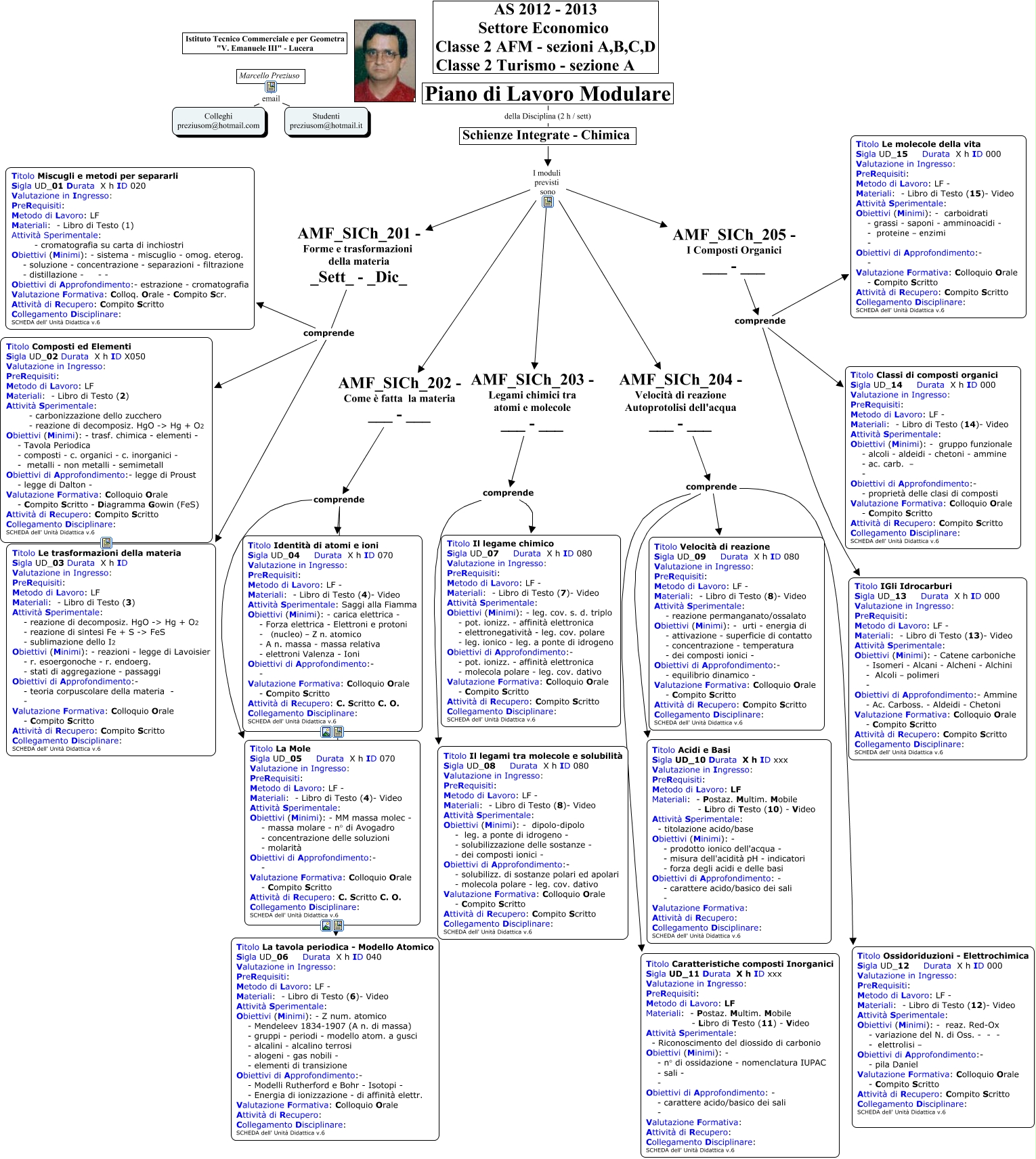 Questa Cmap, creata con IHMC CmapTools, contiene informazioni relative a: AFM_SI_CHI, Marcello Preziuso email Colleghi preziusom@hotmail.com, Schienze Integrate - Chimica I moduli previsti sono AMF_SICh_201 - Forme e trasformazioni della materia _Sett_ - _Dic_, Schienze Integrate - Chimica I moduli previsti sono AMF_SICh_202 - Come è fatta la materia ___ - ___, AMF_SICh_205 - I Composti Organici ___ - ___ comprende Titolo Le molecole della vita Sigla UD_15 Durata X h ID 000 Valutazione in Ingresso: PreRequisiti: Metodo di Lavoro: LF - Materiali: - Libro di Testo (15)- Video Attività Sperimentale: Obiettivi (Minimi): - carboidrati - grassi - saponi - amminoacidi - - proteine - enzimi - Obiettivi di Approfondimento:- - Valutazione Formativa: Colloquio Orale - Compito Scritto Attività di Recupero: Compito Scritto Collegamento Disciplinare: SCHEDA dell' Unità Didattica v.6, AMF_SICh_204 - Velocità di reazione Autoprotolisi dell'acqua ___ - ___ comprende Titolo Velocità di reazione Sigla UD_09 Durata X h ID 080 Valutazione in Ingresso: PreRequisiti: Metodo di Lavoro: LF - Materiali: - Libro di Testo (8)- Video Attività Sperimentale: - reazione permanganato/ossalato Obiettivi (Minimi): - urti - energia di - attivazione - superficie di contatto - concentrazione - temperatura - dei composti ionici - Obiettivi di Approfondimento:- - equilibrio dinamico - Valutazione Formativa: Colloquio Orale - Compito Scritto Attività di Recupero: Compito Scritto Collegamento Disciplinare: SCHEDA dell' Unità Didattica v.6, AMF_SICh_201 - Forme e trasformazioni della materia _Sett_ - _Dic_ comprende Titolo Le trasformazioni della materia Sigla UD_03 Durata X h ID Valutazione in Ingresso: PreRequisiti: Metodo di Lavoro: LF Materiali: - Libro di Testo (3) Attività Sperimentale: - reazione di decomposiz. HgO -> Hg + O2 - reazione di sintesi Fe + S -> FeS - sublimazione dello I2 Obiettivi (Minimi): - reazioni - legge di Lavoisier - r. esoergonoche - r. endoerg. - stati di aggregazione - passaggi Obiettivi di Approfondimento:- - teoria corpuscolare della materia - - Valutazione Formativa: Colloquio Orale - Compito Scritto Attività di Recupero: Compito Scritto Collegamento Disciplinare: SCHEDA dell' Unità Didattica v.6, AMF_SICh_202 - Come è fatta la materia ___ - ___ comprende Titolo Identità di atomi e ioni Sigla UD_04 Durata X h ID 070 Valutazione in Ingresso: PreRequisiti: Metodo di Lavoro: LF - Materiali: - Libro di Testo (4)- Video Attività Sperimentale: Saggi alla Fiamma Obiettivi (Minimi): - carica elettrica - - Forza elettrica - Elettroni e protoni - (nucleo) - Z n. atomico - A n. massa - massa relativa - elettroni Valenza - Ioni Obiettivi di Approfondimento:- - Valutazione Formativa: Colloquio Orale - Compito Scritto Attività di Recupero: C. Scritto C. O. Collegamento Disciplinare: SCHEDA dell' Unità Didattica v.6, AMF_SICh_205 - I Composti Organici ___ - ___ comprende Titolo Classi di composti organici Sigla UD_14 Durata X h ID 000 Valutazione in Ingresso: PreRequisiti: Metodo di Lavoro: LF - Materiali: - Libro di Testo (14)- Video Attività Sperimentale: Obiettivi (Minimi): - gruppo funzionale - alcoli - aldeidi - chetoni - ammine - ac. carb. - - Obiettivi di Approfondimento:- - proprietà delle clasi di composti Valutazione Formativa: Colloquio Orale - Compito Scritto Attività di Recupero: Compito Scritto Collegamento Disciplinare: SCHEDA dell' Unità Didattica v.6, Schienze Integrate - Chimica I moduli previsti sono AMF_SICh_203 - Legami chimici tra atomi e molecole ___ - ___, AMF_SICh_204 - Velocità di reazione Autoprotolisi dell'acqua ___ - ___ comprende Titolo Ossidoriduzioni - Elettrochimica Sigla UD_12 Durata X h ID 000 Valutazione in Ingresso: PreRequisiti: Metodo di Lavoro: LF - Materiali: - Libro di Testo (12)- Video Attività Sperimentale: Obiettivi (Minimi): - reaz. Red-Ox - variazione del N. di Oss. - - - - elettrolisi - Obiettivi di Approfondimento:- - pila Daniel Valutazione Formativa: Colloquio Orale - Compito Scritto Attività di Recupero: Compito Scritto Collegamento Disciplinare: SCHEDA dell' Unità Didattica v.6, AMF_SICh_204 - Velocità di reazione Autoprotolisi dell'acqua ___ - ___ comprende Titolo Caratteristiche composti Inorganici Sigla UD_11 Durata X h ID xxx Valutazione in Ingresso: PreRequisiti: Metodo di Lavoro: LF Materiali: - Postaz. Multim. Mobile - Libro di Testo (11) - Video Attività Sperimentale: - Riconoscimento del diossido di carbonio Obiettivi (Minimi): - - n° di ossidazione - nomenclatura IUPAC - sali - - Obiettivi di Approfondimento: - - carattere acido/basico dei sali - Valutazione Formativa: Attività di Recupero: Collegamento Disciplinare: SCHEDA dell' Unità Didattica v.6, Schienze Integrate - Chimica I moduli previsti sono AMF_SICh_205 - I Composti Organici ___ - ___, Schienze Integrate - Chimica I moduli previsti sono AMF_SICh_204 - Velocità di reazione Autoprotolisi dell'acqua ___ - ___, AMF_SICh_203 - Legami chimici tra atomi e molecole ___ - ___ comprende Titolo Il legame chimico Sigla UD_07 Durata X h ID 080 Valutazione in Ingresso: PreRequisiti: Metodo di Lavoro: LF - Materiali: - Libro di Testo (7)- Video Attività Sperimentale: Obiettivi (Minimi): - leg. cov. s. d. triplo - pot. ionizz. - affinità elettronica - elettronegatività - leg. cov. polare - leg. ionico - leg. a ponte di idrogeno Obiettivi di Approfondimento:- - pot. ionizz. - affinità elettronica - molecola polare - leg. cov. dativo Valutazione Formativa: Colloquio Orale - Compito Scritto Attività di Recupero: Compito Scritto Collegamento Disciplinare: SCHEDA dell' Unità Didattica v.6, AMF_SICh_201 - Forme e trasformazioni della materia _Sett_ - _Dic_ comprende Titolo Composti ed Elementi Sigla UD_02 Durata X h ID X050 Valutazione in Ingresso: PreRequisiti: Metodo di Lavoro: LF Materiali: - Libro di Testo (2) Attività Sperimentale: - carbonizzazione dello zucchero - reazione di decomposiz. HgO -> Hg + O2 Obiettivi (Minimi): - trasf. chimica - elementi - - Tavola Perio