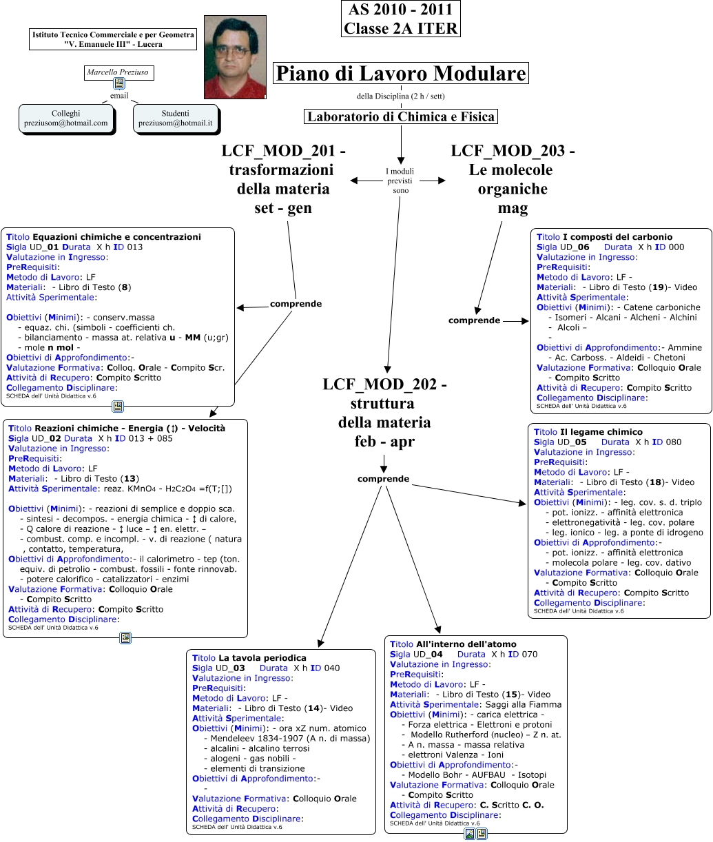 Questa Cmap, creata con IHMC CmapTools, contiene informazioni relative a: LCF_MOD_201_2_3, LCF_MOD_203 - Le molecole organiche mag comprende Titolo I composti del carbonio Sigla UD_06 Durata X h ID 000 Valutazione in Ingresso: PreRequisiti: Metodo di Lavoro: LF - Materiali: - Libro di Testo (19)- Video Attività Sperimentale: Obiettivi (Minimi): - Catene carboniche - Isomeri - Alcani - Alcheni - Alchini - Alcoli - - Obiettivi di Approfondimento:- Ammine - Ac. Carboss. - Aldeidi - Chetoni Valutazione Formativa: Colloquio Orale - Compito Scritto Attività di Recupero: Compito Scritto Collegamento Disciplinare: SCHEDA dell' Unità Didattica v.6, Laboratorio di Chimica e Fisica I moduli previsti sono LCF_MOD_202 - struttura della materia feb - apr, Laboratorio di Chimica e Fisica I moduli previsti sono LCF_MOD_201 - trasformazioni della materia set - gen, Marcello Preziuso email Colleghi preziusom@hotmail.com, LCF_MOD_202 - struttura della materia feb - apr comprende Titolo All'interno dell'atomo Sigla UD_04 Durata X h ID 070 Valutazione in Ingresso: PreRequisiti: Metodo di Lavoro: LF - Materiali: - Libro di Testo (15)- Video Attività Sperimentale: Saggi alla Fiamma Obiettivi (Minimi): - carica elettrica - - Forza elettrica - Elettroni e protoni - Modello Rutherford (nucleo) - Z n. at. - A n. massa - massa relativa - elettroni Valenza - Ioni Obiettivi di Approfondimento:- - Modello Bohr - AUFBAU - Isotopi Valutazione Formativa: Colloquio Orale - Compito Scritto Attività di Recupero: C. Scritto C. O. Collegamento Disciplinare: SCHEDA dell' Unità Didattica v.6, Laboratorio di Chimica e Fisica I moduli previsti sono LCF_MOD_203 - Le molecole organiche mag, LCF_MOD_202 - struttura della materia feb - apr comprende Titolo Il legame chimico Sigla UD_05 Durata X h ID 080 Valutazione in Ingresso: PreRequisiti: Metodo di Lavoro: LF - Materiali: - Libro di Testo (18)- Video Attività Sperimentale: Obiettivi (Minimi): - leg. cov. s. d. triplo - pot. ionizz. - affinità elettronica - elettronegatività - leg. cov. polare - leg. ionico - leg. a ponte di idrogeno Obiettivi di Approfondimento:- - pot. ionizz. - affinità elettronica - molecola polare - leg. cov. dativo Valutazione Formativa: Colloquio Orale - Compito Scritto Attività di Recupero: Compito Scritto Collegamento Disciplinare: SCHEDA dell' Unità Didattica v.6, LCF_MOD_201 - trasformazioni della materia set - gen comprende Titolo Reazioni chimiche - Energia (↕) - Velocità Sigla UD_02 Durata X h ID 013 + 085 Valutazione in Ingresso: PreRequisiti: Metodo di Lavoro: LF Materiali: - Libro di Testo (13) Attività Sperimentale: reaz. KMnO4 - H2C2O4 =f(T;[]) Obiettivi (Minimi): - reazioni di semplice e doppio sca. - sintesi - decompos. - energia chimica - ↕ di calore, - Q calore di reazione - ↕ luce - ↕ en. elettr. - - combust. comp. e incompl. - v. di reazione ( natura , contatto, temperatura, Obiettivi di Approfondimento:- il calorimetro - tep (ton. equiv. di petrolio - combust. fossili - fonte rinnovab. - potere calorifico - catalizzatori - enzimi Valutazione Formativa: Colloquio Orale - Compito Scritto Attività di Recupero: Compito Scritto Collegamento Disciplinare: SCHEDA dell' Unità Didattica v.6, Marcello Preziuso email Studenti preziusom@hotmail.it, LCF_MOD_201 - trasformazioni della materia set - gen comprende Titolo Equazioni chimiche e concentrazioni Sigla UD_01 Durata X h ID 013 Valutazione in Ingresso: PreRequisiti: Metodo di Lavoro: LF Materiali: - Libro di Testo (8) Attività Sperimentale: Obiettivi (Minimi): - conserv.massa - equaz. chi. (simboli - coefficienti ch. - bilanciamento - massa at. relativa u - MM (u;gr) - mole n mol - Obiettivi di Approfondimento:- Valutazione Formativa: Colloq. Orale - Compito Scr. Attività di Recupero: Compito Scritto Collegamento Disciplinare: SCHEDA dell' Unità Didattica v.6, Piano di Lavoro Modulare della Disciplina (2 h / sett) Laboratorio di Chimica e Fisica, LCF_MOD_202 - struttura della materia feb - apr comprende Titolo La tavola periodica Sigla UD_03 Durata X h ID 040 Valutazione in Ingresso: PreRequisiti: Metodo di Lavoro: LF - Materiali: - Libro di Testo (14)- Video Attività Sperimentale: Obiettivi (Minimi): - ora xZ num. atomico - Mendeleev 1834-1907 (A n. di massa) - alcalini - alcalino terrosi - alogeni - gas nobili - - elementi di transizione Obiettivi di Approfondimento:- - Valutazione Formativa: Colloquio Orale Attività di Recupero: Collegamento Disciplinare: SCHEDA dell' Unità Didattica v.6