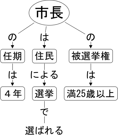 このコンセプトマップに関連する情報: コンセプトマップの説明用2, 被選挙権 は 満25歳以上, 市長 は 住民, 任期 は 4年, 市長 の 被選挙権, 住民 による 選挙, 市長 の 任期, 選挙 で 選ばれる
