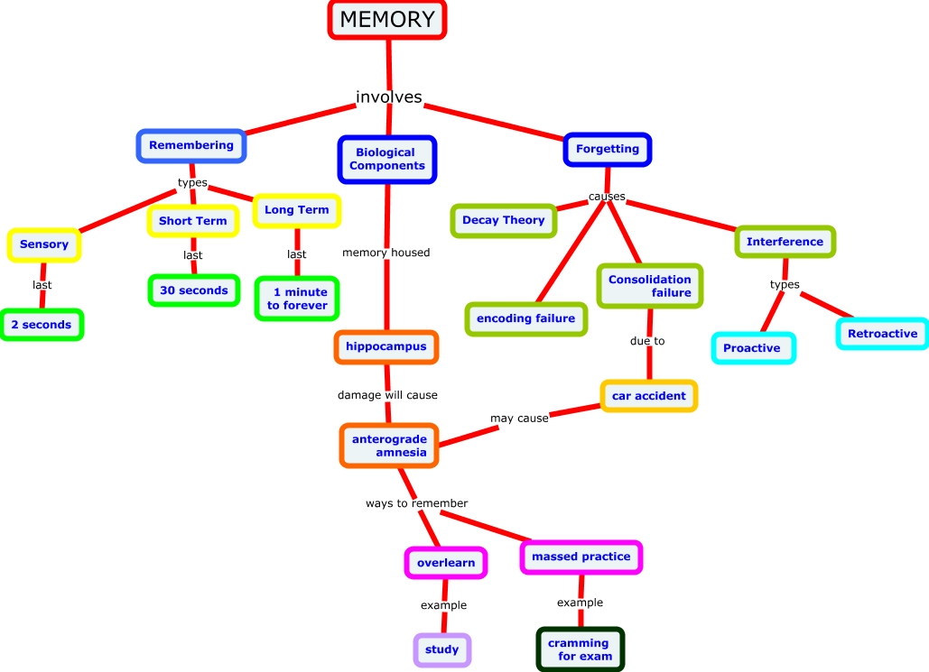 Chapter 6 (Jacqueline Chrispen), Consolidation failure due to car accident, hippocampus damage will cause anterograde amnesia, massed practice example cramming for exam, anterograde amnesia ways to remember overlearn, car accident may cause anterograde amnesia, Biological Components memory housed hippocampus, Remembering types Short Term, Short Term last 30 seconds, Remembering types Sensory, Sensory last 2 seconds