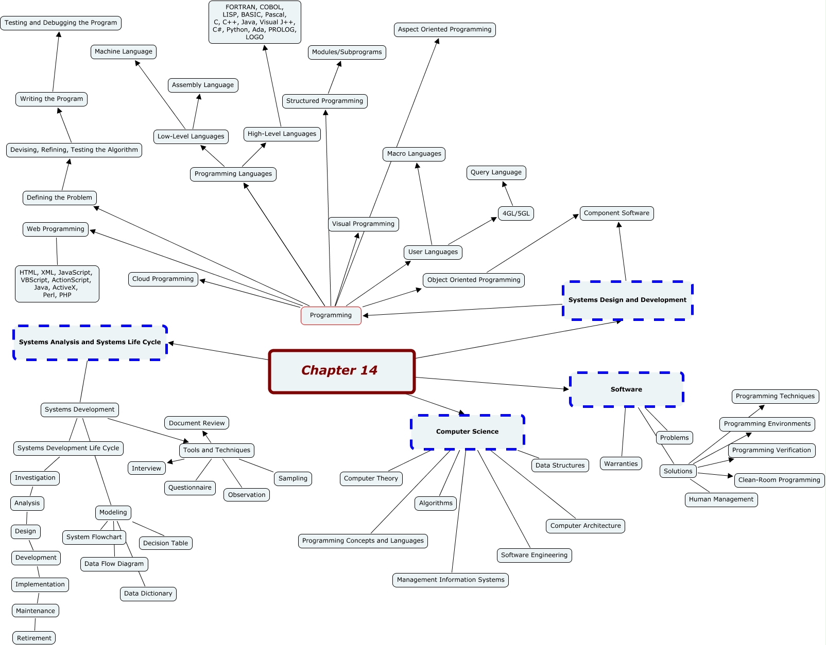 This Concept Map, created with IHMC CmapTools, has information related to: ARAV, Software Warranties, Programming Programming Languages, Computer Science Programming Concepts and Languages, Systems Design and Development Programming, Chapter 14 Computer Science, Chapter 14 Systems Analysis and Systems Life Cycle, Low-Level Languages Assembly Language, Tools and Techniques Sampling, Structured Programming Modules/Subprograms, Development Implementation, Solutions Programming Verification, Maintenance Retirement, User Languages Macro Languages, Chapter 14 Systems Design and Development, Computer Science Computer Theory, Programming Programming Languages, High-Level Languages FORTRAN, COBOL, LISP, BASIC, Pascal, C, C++, Java, Visual J++, C#, Python, Ada, PROLOG, LOGO, Modeling Decision Table, Object Oriented Programming Component Software, Analysis Design