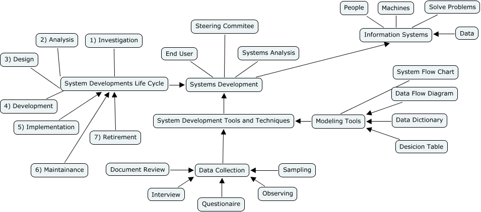 This Concept Map, created with IHMC CmapTools, has information related to: ANANT, Questionaire Data Collection, Sampling Data Collection, 6) Maintainance System Developments Life Cycle, 1) Investigation System Developments Life Cycle, Machines Information Systems, Data Dictionary Modeling Tools, 3) Design System Developments Life Cycle, Systems Development Information Systems, Data Flow Diagram Modeling Tools, Observing Data Collection, 5) Implementation System Developments Life Cycle, System Flow Chart Modeling Tools, Interview Data Collection, Desicion Table Modeling Tools, 7) Retirement System Developments Life Cycle, People Information Systems, Document Review Data Collection, System Development Tools and Techniques Systems Development, End User Systems Development, 2) Analysis System Developments Life Cycle