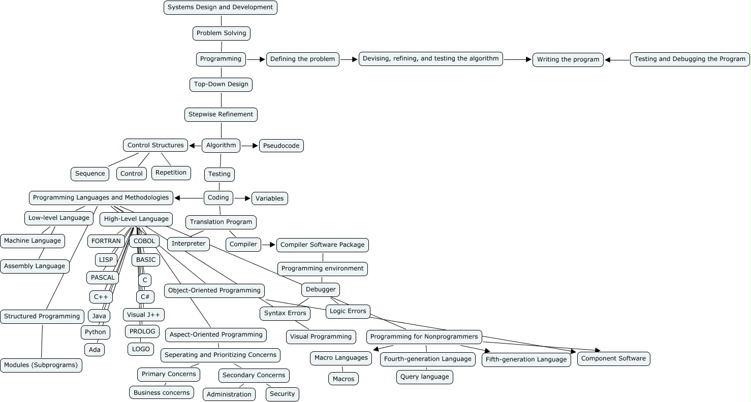 This Concept Map, created with IHMC CmapTools, has information related to: ARTHUR, Seperating and Prioritizing Concerns Secondary Concerns, Coding Variables, Stepwise Refinement Algorithm, Aspect-Oriented Programming Seperating and Prioritizing Concerns, Coding Programming Languages and Methodologies, High-Level Language LISP, Problem Solving Programming, Translation Program Compiler, Low-level Language Assembly Language, High-Level Language Java, Secondary Concerns Administration, Programming environment Debugger, Programming Defining the problem, Structured Programming Modules (Subprograms), Top-Down Design Stepwise Refinement, Control Structures Sequence, Seperating and Prioritizing Concerns Primary Concerns, Testing Coding, Fourth-generation Language Query language, Systems Design and Development Problem Solving