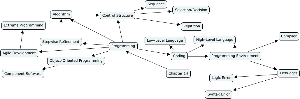 This Concept Map, created with IHMC CmapTools, has information related to: THOMAS, Programming Environment Compiler, Programming Environment High-Level Language, Coding Low-Level Language, Programming Algorithm, Programming Control Structure, Programming Environment Debugger, Stepwise Refinement Algorithm, Programming Agile Development, Programming Object-Oriented Programming, Object-Oriented Programming Component Software, Programming Stepwise Refinement, Agile Development Extreme Programming, Algorithm Control Structure, Debugger Logic Error, Chapter 14 Programming, Control Structure Selection/Decision, Debugger Syntax Error, Control Structure Repitition, Programming Coding, Coding High-Level Language