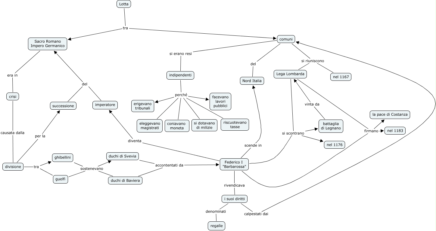 Questa Cmap, creata con IHMC CmapTools, contiene informazioni relative a: barbarossa, Federico I "Barbarossa" scende in Nord Italia, ghibellini sostenevano duchi di Svevia, i suoi diritti denominati regalìe, comuni si riuniscono nel 1167, comuni del Nord Italia, Lega Lombarda firmano nel 1183, Federico I "Barbarossa" si scontrano battaglia di Legnano, Federico I "Barbarossa" firmano nel 1183, guelfi sostenevano duchi di Svevia, comuni si riuniscono Lega Lombarda, battaglia di Legnano vinta da Lega Lombarda, duchi di Baviera accontentati da Federico I "Barbarossa", indipendenti perché facevano lavori pubblici, indipendenti perché riscuotevano tasse, Federico I "Barbarossa" diventa imperatore, imperatore del Sacro Romano Impero Germanico, Lotta tra comuni, divisione tra guelfi, ghibellini sostenevano duchi di Baviera, Lega Lombarda firmano la pace di Costanza