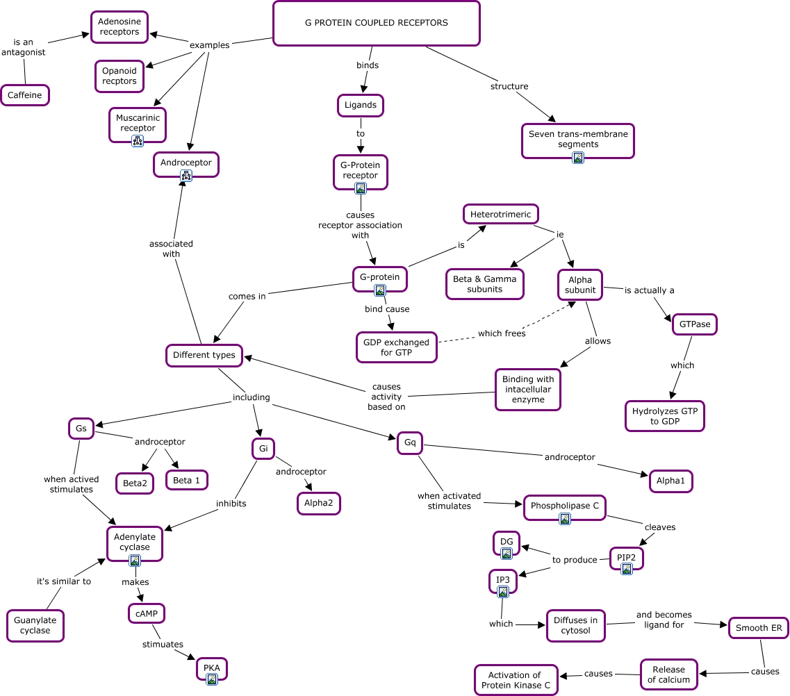 Este Cmap, tiene información relacionada con: 27. G-Proteins, G PROTEIN COUPLED RECEPTORS examples Androceptor, Release of calcium causes Activation of Protein Kinase C, G PROTEIN COUPLED RECEPTORS examples Adenosine receptors, cAMP stimuates PKA, Caffeine is an antagonist Adenosine receptors, G PROTEIN COUPLED RECEPTORS examples Muscarinic receptor, G-protein comes in Different types, Gi inhibits Adenylate cyclase, Heterotrimeric ie Beta & Gamma subunits, Adenylate cyclase makes cAMP, Heterotrimeric ie Alpha subunit, Different types associated with Androceptor, Guanylate cyclase it's similar to Adenylate cyclase, Gs when actived stimulates Adenylate cyclase, Ligands to G-Protein receptor, G PROTEIN COUPLED RECEPTORS binds Ligands, IP3 which Diffuses in cytosol, Different types including Gi, Different types including Gs, G PROTEIN COUPLED RECEPTORS structure Seven trans-membrane segments