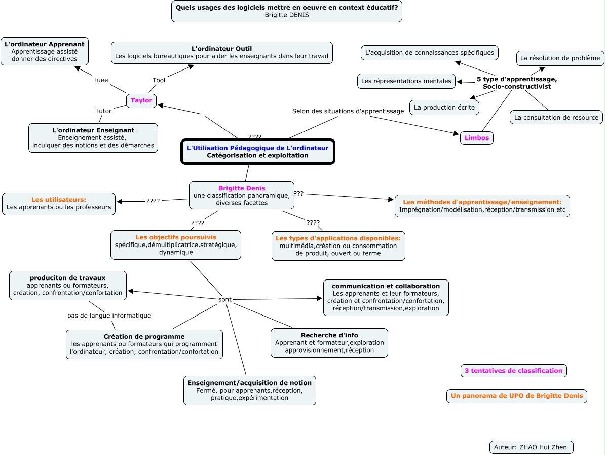 Cette carte de concepts créée avec IHMC CmapTools traite de: Brigitte DENIS_ZHAO Hui Zhen, Les objectifs poursuivis spécifique,démultiplicatrice,stratégique, dynamique sont communication et collaboration Les apprenants et leur formateurs, création et confrontation/confortation, réception/transmission,exploration, L'Utilisation Pédagogique de L'ordinateur Catégorisation et exploitation ???? Brigitte Denis une classification panoramique, diverses facettes, Limbos 5 type d'apprentissage, Socio-constructivist La production écrite, Brigitte Denis une classification panoramique, diverses facettes ???? Les types d'applications disponibles: multimédia,création ou consommation de produit, ouvert ou ferme, Brigitte Denis une classification panoramique, diverses facettes ???? Les utilisateurs: Les apprenants ou les professeurs, produciton de travaux apprenants ou formateurs, création, confrontation/confortation pas de langue informatique ????, Limbos 5 type d'apprentissage, Socio-constructivist La consultation de résource, Taylor Tuee L'ordinateur Apprenant Apprentissage assisté donner des directives, L'Utilisation Pédagogique de L'ordinateur Catégorisation et exploitation Taylor, Les objectifs poursuivis spécifique,démultiplicatrice,stratégique, dynamique sont produciton de travaux apprenants ou formateurs, création, confrontation/confortation, Les objectifs poursuivis spécifique,démultiplicatrice,stratégique, dynamique sont Création de programme les apprenants ou formateurs qui programment l'ordinateur, création, confrontation/confortation, Limbos 5 type d'apprentissage, Socio-constructivist La résolution de problème, Taylor Tutor L'ordinateur Enseignant Enseignement assisté, inculquer des notions et des démarches, Brigitte Denis une classification panoramique, diverses facettes ???? Les méthodes d'apprentissage/enseignement: Imprégnation/modélisation,réception/transmission etc, Taylor Tool L'ordinateur Outil Les logiciels bureautiques pour aider les enseignants dans leur travail, Brigitte Denis une classification panoramique, diverses facettes ???? Les objectifs poursuivis spécifique,démultiplicatrice,stratégique, dynamique, Limbos 5 type d'apprentissage, Socio-constructivist L'acquisition de connaissances spécifiques, Limbos 5 type d'apprentissage, Socio-constructivist Les répresentations mentales, L'Utilisation Pédagogique de L'ordinateur Catégorisation et exploitation Selon des situations d'apprentissage Limbos, Les objectifs poursuivis spécifique,démultiplicatrice,stratégique, dynamique sont Enseignement/acquisition de notion Fermé, pour apprenants,réception, pratique,expérimentation