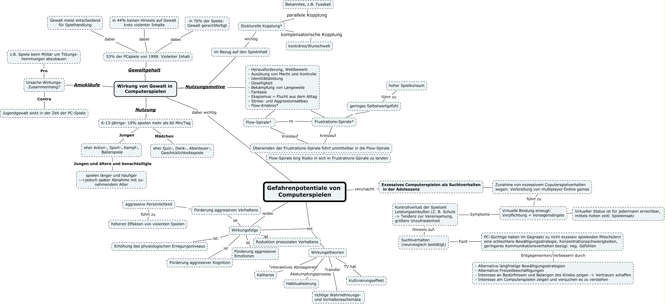 Dieses mit IHMC CmapTools erstellte CMap hat Informationen bezüglich: Aufgabe 3, PC-Süchtige haben im Gegnsatz zu nicht exzessiv spielenden Mitschülern eine schlechtere Bewältigungsstrategie, Konzentrationsschwierigkeiten, geringeres Kommunikationsverhalten bezügl. neg. Gefühlen Entgegenwirken/Verbessern durch - Alternative langfristige Bewältigungsstrategien - Alternative Freizeitbeschäftigungen - Interesse an Bedürfnissen und Belangen des Kindes zeigen -> Vertrauen schaffen - Interesse am Computerspielen zeigen und versuchen es zu verstehen, Wirkungstheorien Transfer richtige Wahrnehmungs- und Verhaltensschemata, Wirkungstheorien Abstumpfungsprozess Habitualisierung, Wirkungstheorien "interaktives Abreagieren" Katharsis, Wirkungsfolge ist Förderung aggressiver Kognition, 6-13-jährige: 19% spielen mehr als 60 Min/Tag Jungen eher Action-, Sport-, Kampf-, Ballerspiele, eher Action-, Sport-, Kampf-, Ballerspiele Jungen und ältere und benachteiligte spielen länger und häufiger -->jedoch später Abnahme mit zu- nehmendem Alter, Wirkung von Gewalt in Computerspielen Amokläufe Ursache-Wirkungs- Zusammenhang?, Ursache-Wirkungs- Zusammenhang? Pro z.B. Spiele beim Militär um Tötungs- hemmungen abzubauen, 53% der PCspiele von 1998: Violenter Inhalt dabei in 44% keinen Hinweis auf Gewalt trotz violenter Inhalte, Stukturelle Kopplung* parallele Kopplung Bekanntes, z.B. Fussball, Stukturelle Kopplung* kompensatorische Kopplung konträres/Wunschwelt, Wirkung von Gewalt in Computerspielen Nutzungsmotive - Herausforderung, Wettbewerb - Ausübung von Macht und Kontrolle - Identitätsbildung - Geselligkeit - Bekämpfung von Langeweile - Fantasie - Ekapismus = Flucht aus dem Alltag - Stress- und Aggressionsabbau - Flow-Erlebnis*, Wirkung von Gewalt in Computerspielen Nutzungsmotive im Bezug auf den Spielinhalt, Wirkung von Gewalt in Computerspielen Nutzungsmotive im Bezug auf den Spielinhalt, im Bezug auf den Spielinhalt wichtig Stukturelle Kopplung*, Flow-Spirale* Kreislauf Überwinden der Frustrations-Spirale führt unmittelbar in die Flow-Spirale, Frustrations-Spirale* Kreislauf Überwinden der Frustrations-Spirale führt unmittelbar in die Flow-Spirale, Gefahrenpotentiale von Computerspielen verursacht Exzessives Computerspielen als Suchtverhalten in der Adoleszenz, Gefahrenpotentiale von Computerspielen mit Wirkungstheorien
