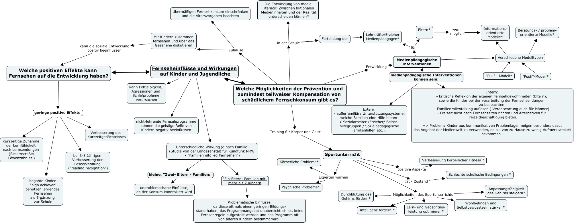 Dieses mit IHMC CmapTools erstellte CMap hat Informationen bezüglich: Aufgabe 2, Medienpädagogische Interventionen medienpädagogische Interventionen können sein: Intern: - kritische Reflexion der eigenen Fernsehgewohnheiten (Eltern), sowie die Kinder bei der verarbeitung der Fernsehsendungen zu beobachten. - Familienrollenteilung auflösen ( Verantwortung auch für Männer). - Freizeit nicht nach Fernsehzeiten richten und Alternativen für Freizeitbeschäftigung bieten. => Problem: Kinder aus kommunikativen Problemlagen neigen besonders dazu, das Angebot der Medienwelt zu verwenden, da sie von zu Hause zu wenig Aufmerksamkeit bekommen., Medienpädagogische Interventionen für Eltern*, Medienpädagogische Interventionen für Lehrkräfte/Erzieher Medienpädagogen*, Welche positiven Effekte kann Fernsehen auf die Entwicklung haben? Fernseheinflüsse und Wirkungen auf Kinder und Jugendliche Unterschiedliche Wirkung je nach Familie: (Studie von der Landesanstalt für Rundfunk NRW - "Familienmitglied Fernsehen"), Sportunterricht Möglichkeiten des Sportunterrichts Anpassungsfähigkeit des Gehirns steigern*, Sportunterricht Möglichkeiten des Sportunterrichts Intelligenz fördern *, Sportunterricht Möglichkeiten des Sportunterrichts Durchblutung des Gehirns fördern*, Sportunterricht Experten warnen Psychische Probleme*, Welche Möglichkeiten der Prävention und zumindest teilweiser Kompensation von schädlichem Fernsehkonsum gibt es? in der Schule Die Entwicklung von media literacy: Zwischen fiktionalen Medieninhalten und der Realität unterscheiden können*, Welche Möglichkeiten der Prävention und zumindest teilweiser Kompensation von schädlichem Fernsehkonsum gibt es? Zuhause Mit Kindern zusammen fernsehen und über das Gesehene diskutieren, "Push"-Modell* ???? Verschiedene Modelltypen, Welche Möglichkeiten der Prävention und zumindest teilweiser Kompensation von schädlichem Fernsehkonsum gibt es? Zuhause Übermäßigen Fernsehkonsum einschränken und die Altersvorgaben beachten, Verschiedene Modelltypen ???? Informations- orientierte Modelle*, Mit Kindern zusammen fernsehen und über das Gesehene diskutieren kann die soziale Entwicklung positiv beeinflussen Welche positiven Effekte kann Fernsehen auf die Entwicklung haben?, Sportunterricht Ist - Zustand Schlechte schulische Bedingungen *, Welche positiven Effekte kann Fernsehen auf die Entwicklung haben? Fernseheinflüsse und Wirkungen auf Kinder und Jugendliche Welche Möglichkeiten der Prävention und zumindest teilweiser Kompensation von schädlichem Fernsehkonsum gibt es?, Medienpädagogische Interventionen ???? Verschiedene Modelltypen, Welche Möglichkeiten der Prävention und zumindest teilweiser Kompensation von schädlichem Fernsehkonsum gibt es? Entwicklung Medienpädagogische Interventionen, Welche positiven Effekte kann Fernsehen auf die Entwicklung haben? geringe positive Effekte Verbesserung des Kurzzeitgedächtnisses, Welche positiven Effekte kann Fernsehen auf die Entwicklung haben? geringe positive Effekte bei 3-5 Jährigen: Verbesserung der Leseerkennung ("reading recognition")