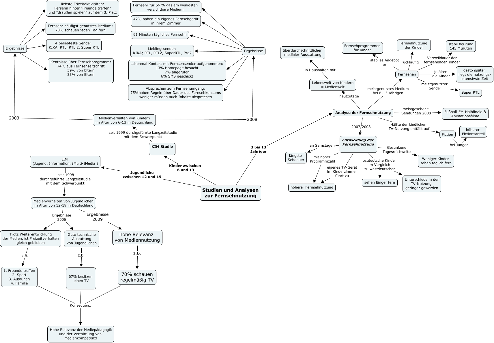 Dieses mit IHMC CmapTools erstellte CMap hat Informationen bezüglich: Aufgabe 2, Ergebnisse schonmal Kontakt mit Fernsehsender aufgenommen: 13% Homepage besucht 7% angerufen 6% SMS geschickt, Ergebnisse Lieblingssender: KIKA; RTL, RTL2, SuperRTL, Pro7, Ergebnisse Fernsehr für 66 % das am wenigsten verzichtbare Medium, Entwicklung der Fernsehnutzung ostdeutsche Kinder im Vergleich zu westdeutschen Unterschiede in der TV-Nutzung geringer geworden, Medienverhalten von Kindern im Alter von 6-13 in Deutschland 2003 Ergebnisse, Fiction bei Jungen höherer Fictionsanteil, KIM Studie seit 1999 durchgeführte Langzeitstudie mit dem Schwerpunkt Medienverhalten von Kindern im Alter von 6-13 in Deutschland, Analyse der Fernsehnutzung Hälfte der kindlichen TV-Nutzung entfällt auf Fiction, Analyse der Fernsehnutzung meistgesehene Sendungen 2008 Fußball-EM-Halbfinale & Animationsfilme, Entwicklung der Fernsehnutzung ostdeutsche Kinder im Vergleich zu westdeutschen sehen länger fern, Entwicklung der Fernsehnutzung Gesunkene Tagesreichweite Weniger Kinder sehen täglich fern, 1. Freunde treffen 2. Sport 3. Ausruhen 4. Familie Konsequenz Hohe Relevanz der Mediepädagogik und der Vermittlung von Medienkompetenz!, Medienverhalten von Jugendlichen im Alter von 12-19 in Deutschland Ergebnisse 2006 Gute technische Austattung von Jugendlichen, Trotz Weiterentwicklung der Medien, ist Freizeitverhalten gleich geblieben z.B. 1. Freunde treffen 2. Sport 3. Ausruhen 4. Familie, Medienverhalten von Jugendlichen im Alter von 12-19 in Deutschland Ergebnisse 2006 Trotz Weiterentwicklung der Medien, ist Freizeitverhalten gleich geblieben, JIM (Jugend, Information, (Multi-)Media ) seit 1998 durchgeführte Langzeitstudie mit dem Schwerpunkt Medienverhalten von Jugendlichen im Alter von 12-19 in Deutschland, Analyse der Fernsehnutzung heutzutage Lebenswelt von Kindern = Medienwelt, Fernsehen stabiles Angebot an Fernsehprogrammen für Kinder, Studien und Analysen zur Fernsehnutzung Jugendliche zwischen 12 und 19 JIM (Jugend, Information, (Multi-)Media ), Studien und Analysen zur Fernsehnutzung Kinder zwischen 6 und 13 KIM Studie