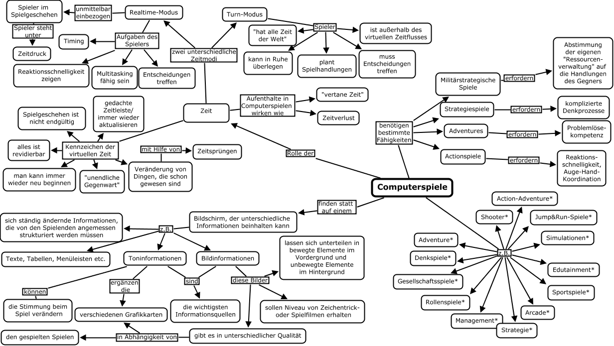 Dieses mit IHMC CmapTools erstellte CMap hat Informationen bezüglich: Aufgabe 3, Zeit Kennzeichen der virtuellen Zeit gedachte Zeitleiste/ immer wieder aktualisieren, Zeit Kennzeichen der virtuellen Zeit alles ist revidierbar, Turn-Modus Spieler ist außerhalb des virtuellen Zeitflusses, Turn-Modus Spieler "hat alle Zeit der Welt", Spieler im Spielgeschehen Spieler steht unter Zeitdruck, Zeit zwei unterschiedliche Zeitmodi Turn-Modus, Computerspiele Rolle der Zeit, Computerspiele z.B. Gesellschaftsspiele*, Computerspiele z.B. Simulationen*, Toninformationen sind die wichtigsten Informationsquellen, Bildschirm, der unterschiedliche Informationen beinhalten kann z.B. sich ständig ändernde Informationen, die von den Spielenden angemessen strukturiert werden müssen, Bildschirm, der unterschiedliche Informationen beinhalten kann z.B. Texte, Tabellen, Menüleisten etc., Bildschirm, der unterschiedliche Informationen beinhalten kann z.B. Bildinformationen, Bildinformationen sind die wichtigsten Informationsquellen, Computerspiele finden statt auf einem Bildschirm, der unterschiedliche Informationen beinhalten kann, Computerspiele benötigen bestimmte Fähigkeiten Adventures, Computerspiele benötigen bestimmte Fähigkeiten Militärstrategische Spiele, Militärstrategische Spiele erfordern Abstimmung der eigenen "Ressourcen- verwaltung" auf die Handlungen des Gegners, Actionspiele erfordern Reaktions- schnelligkeit, Auge-Hand- Koordination, Zeit Aufenthalte in Computerspielen wirken wie Zeitverlust